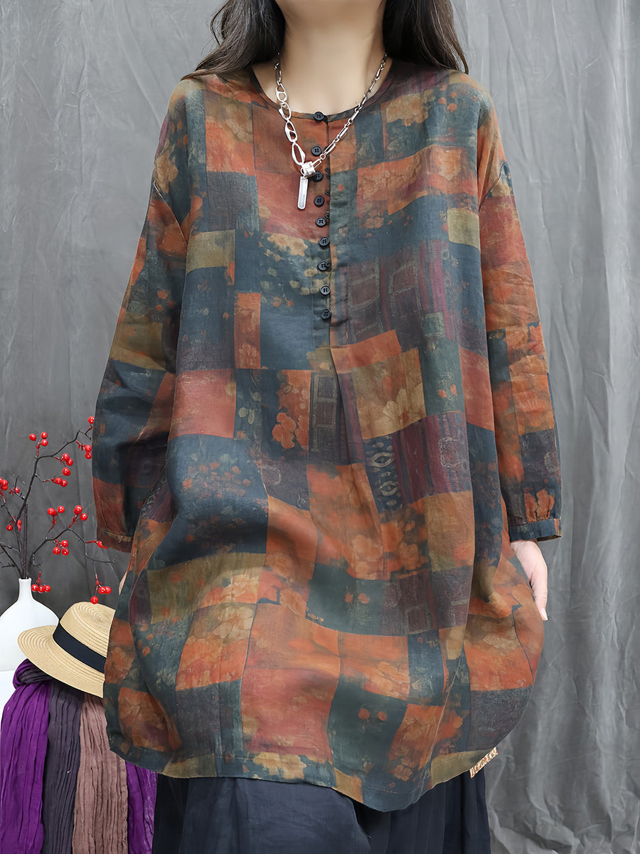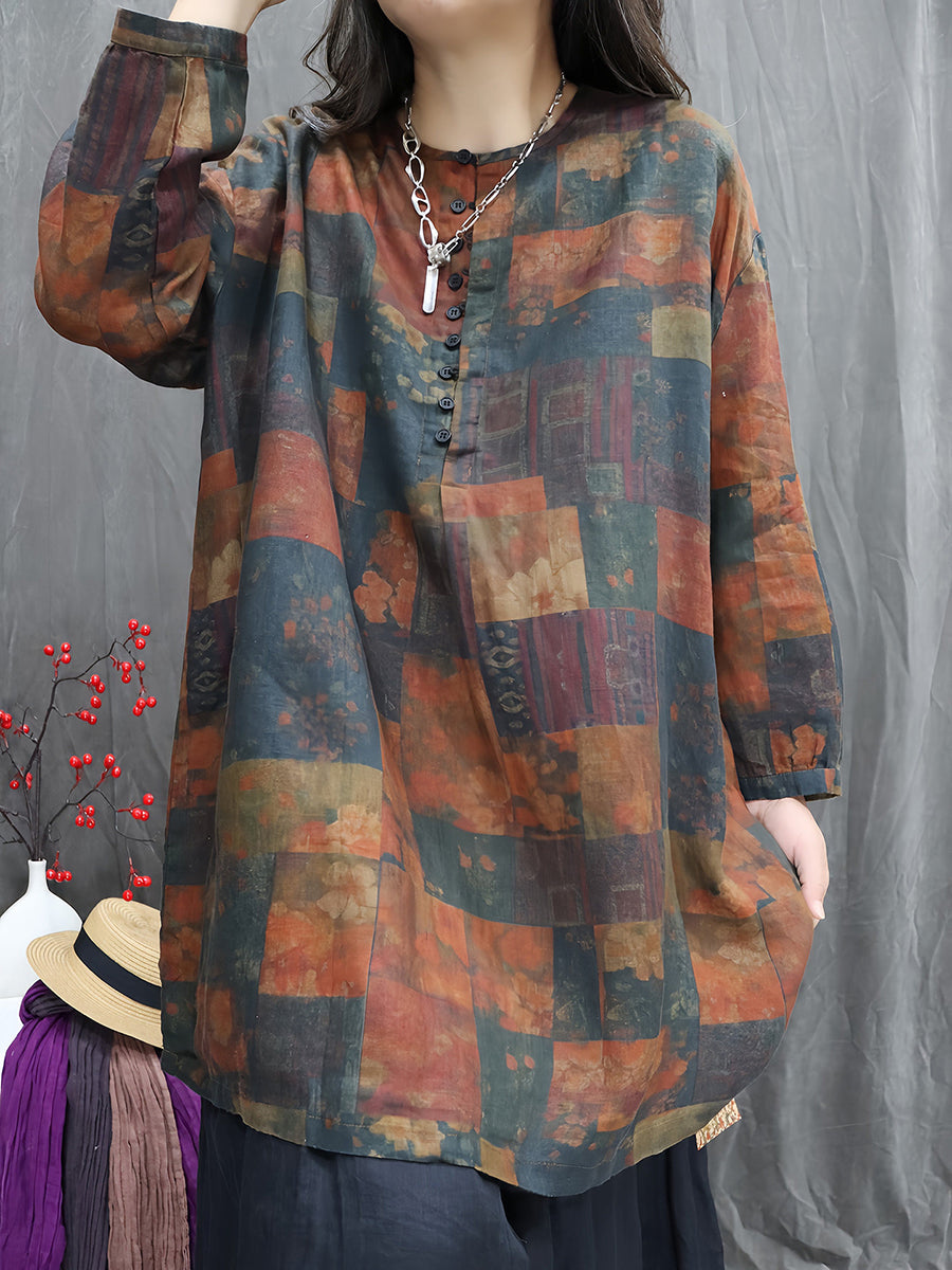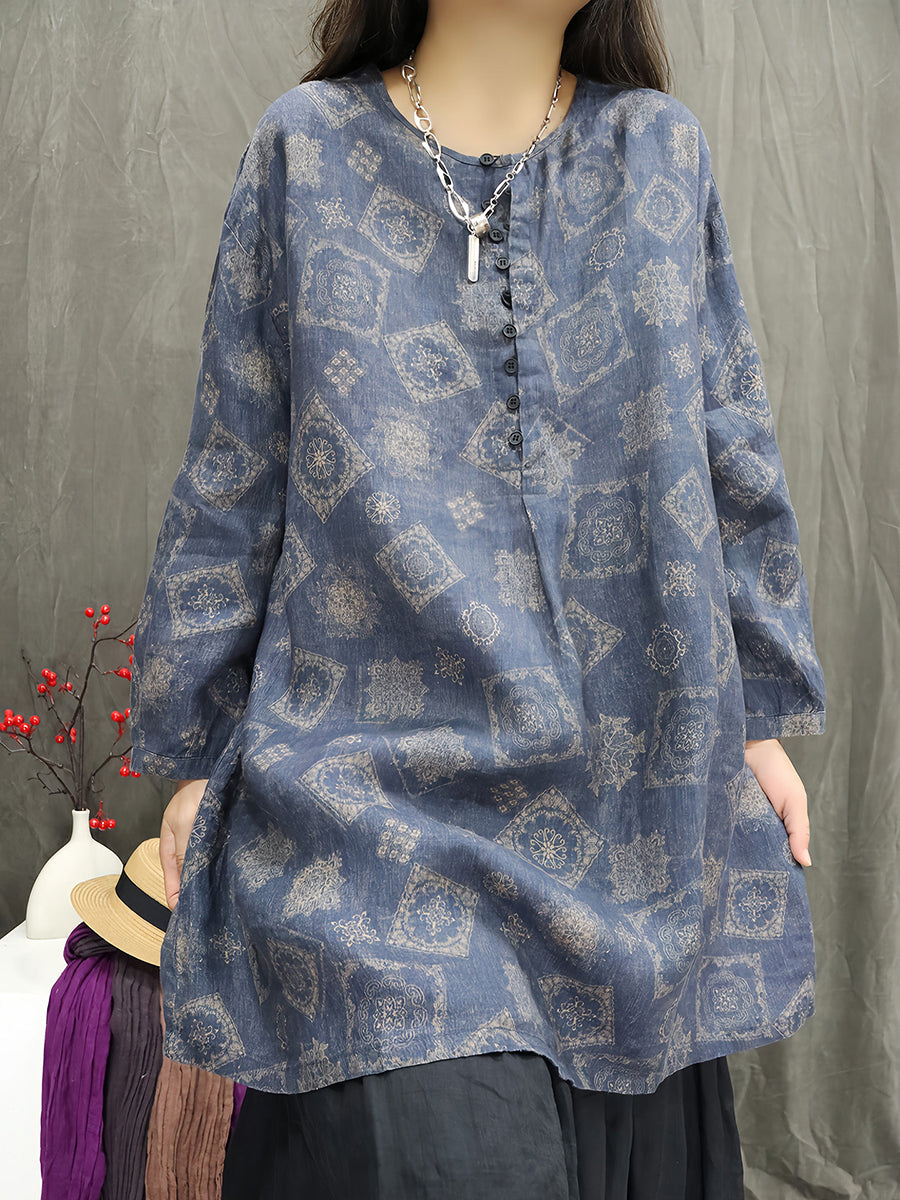 Künstlerische Frühlingsbluse mit Blumenmuster, Rundhalsausschnitt, 100 % Leinen