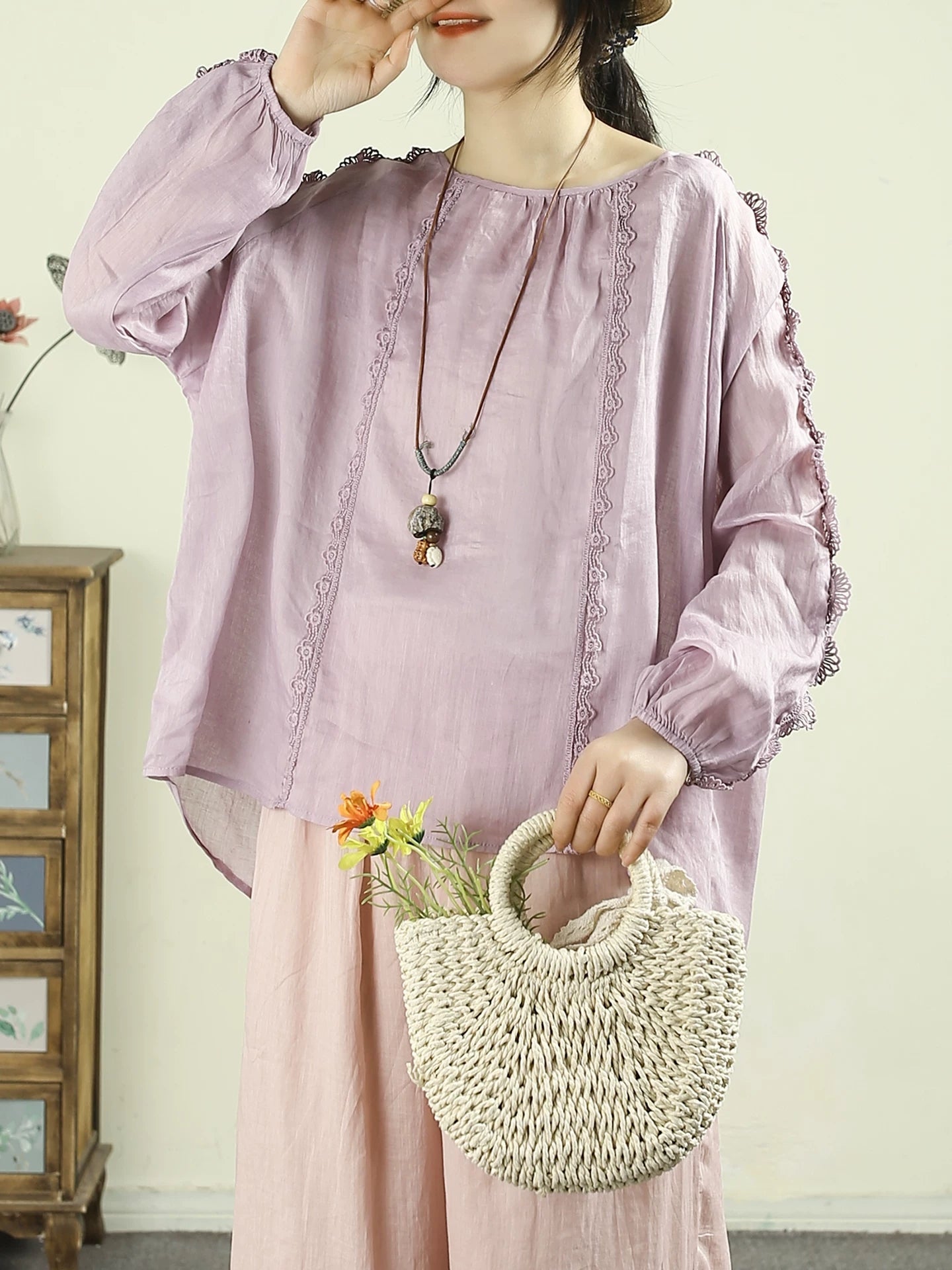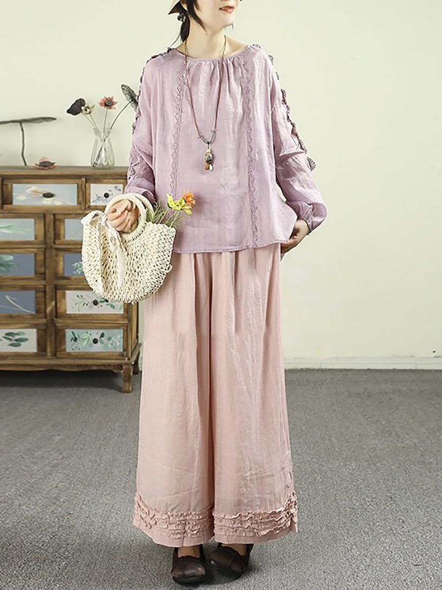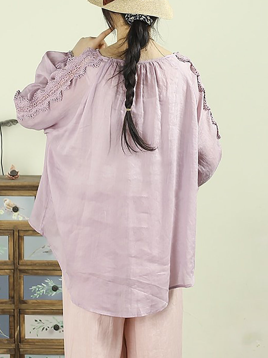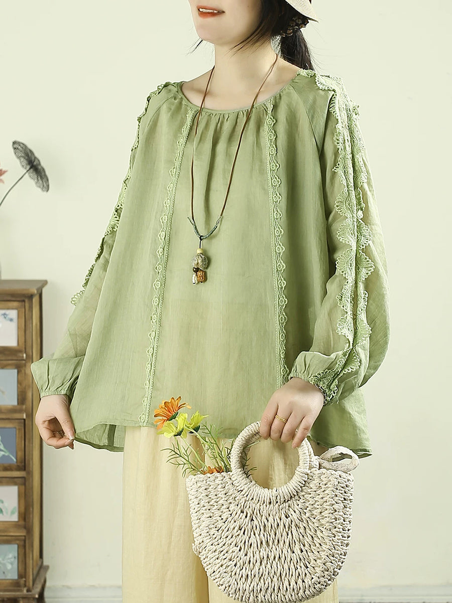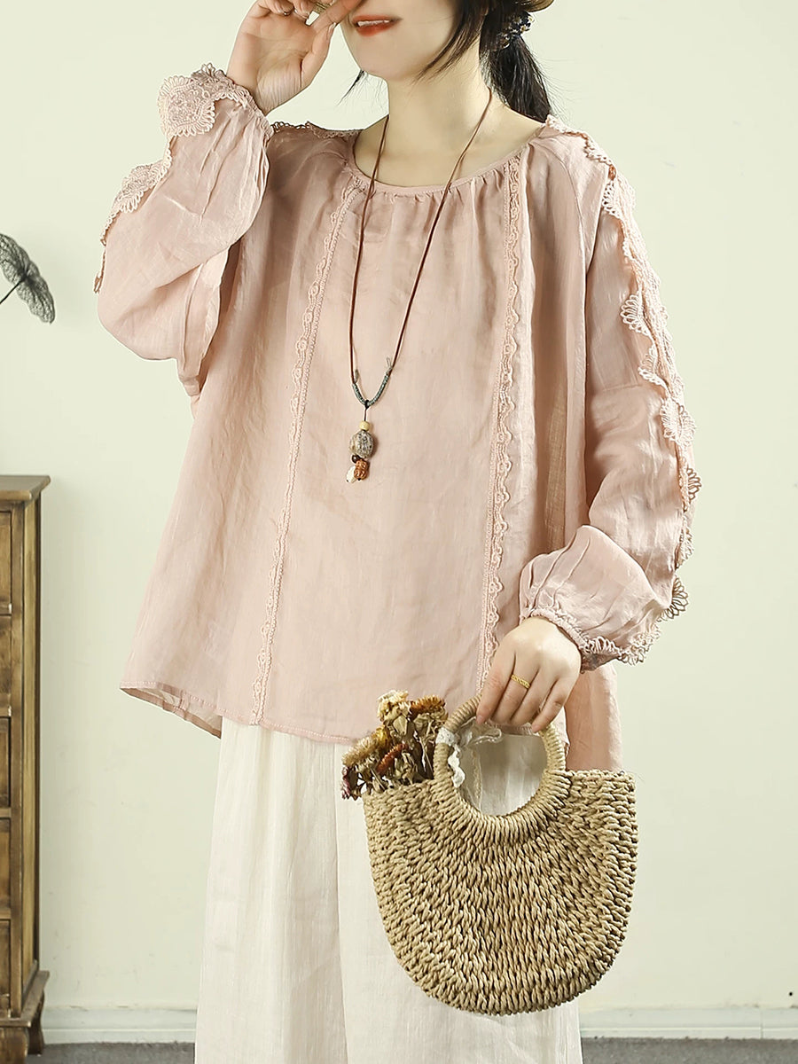 Artsy Spring Damenbluse mit Spitzeneinsatz und Rundhalsausschnitt aus 100 % Ramie