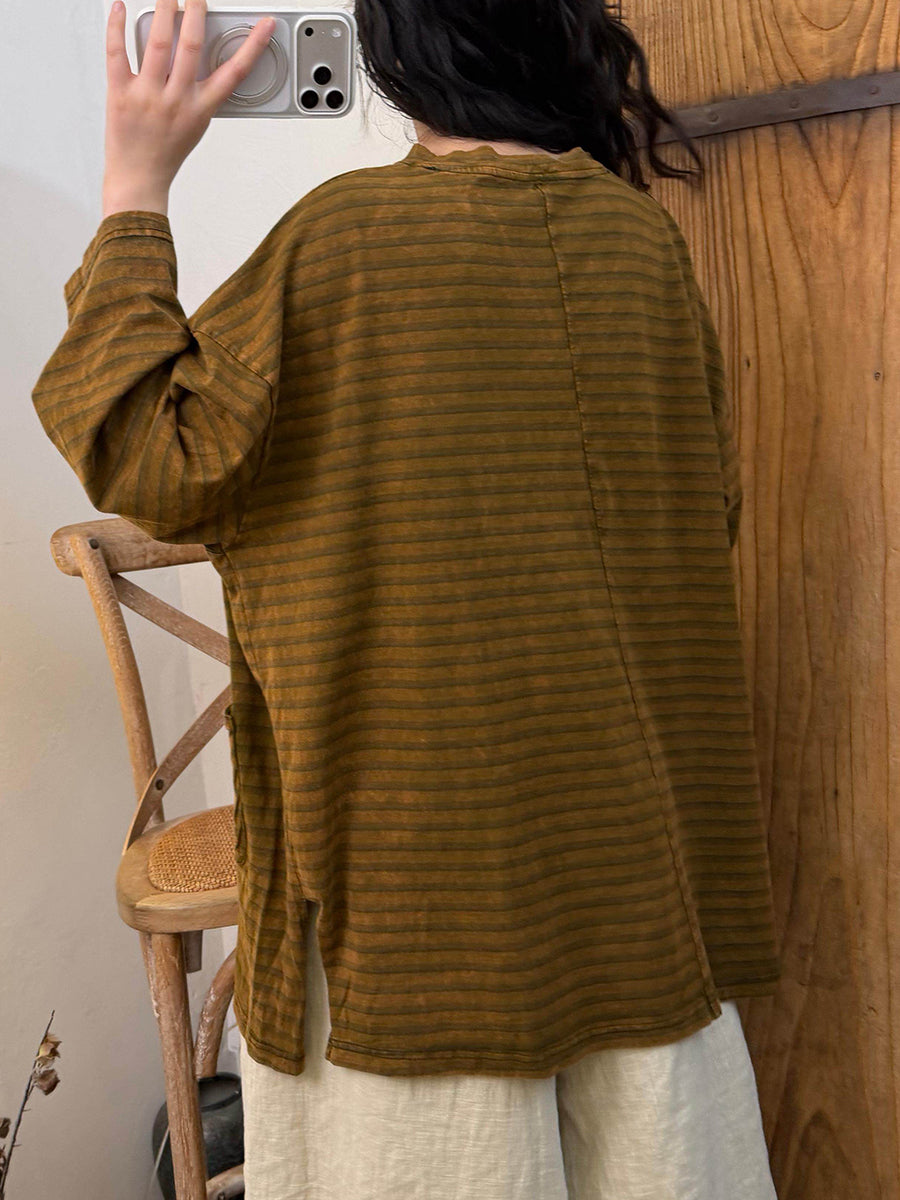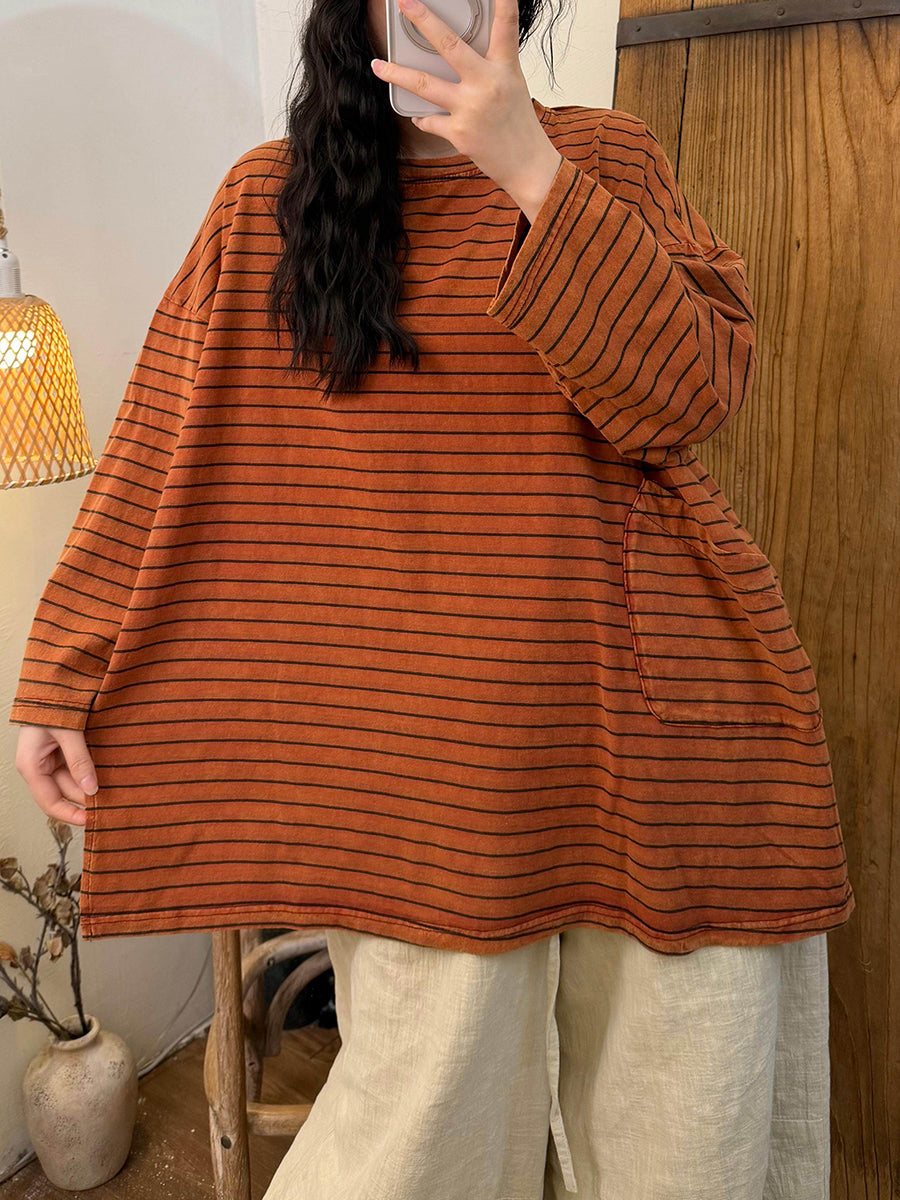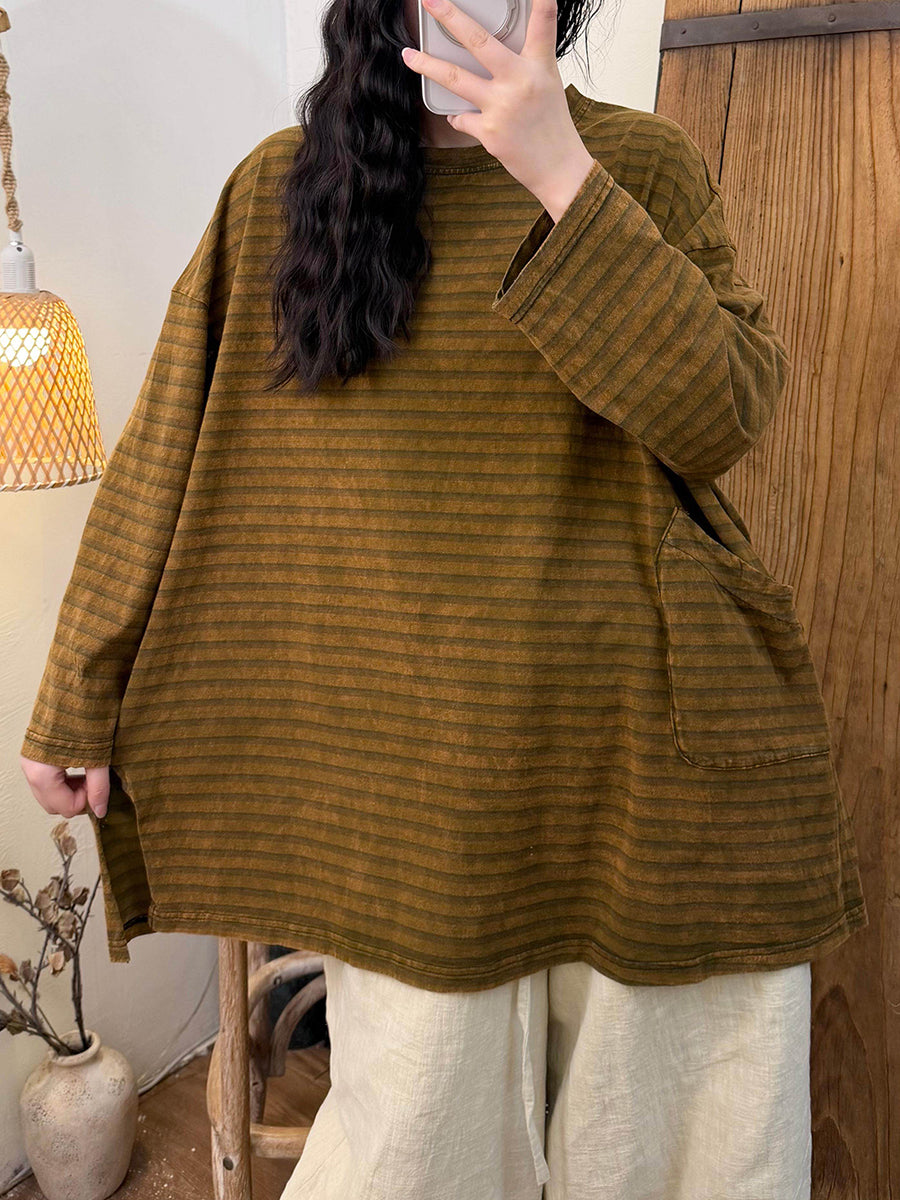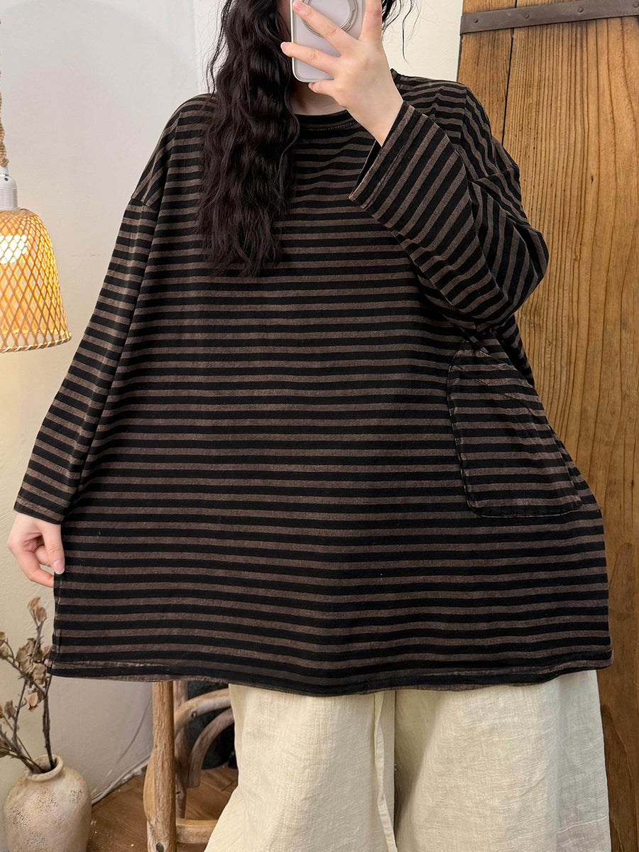 Damenbluse mit künstlerischem Frühlingsstreifen aus Baumwolle mit Rundhalsausschnitt