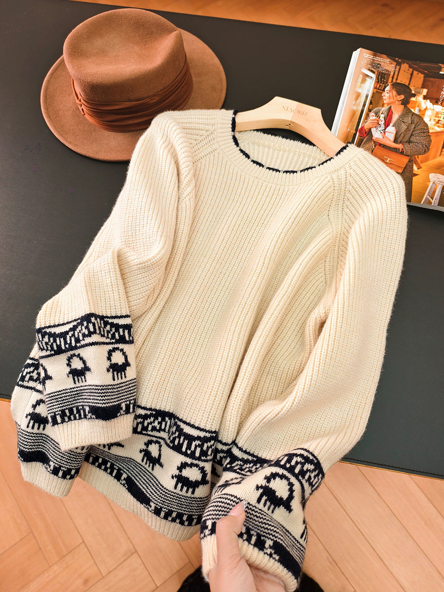 Damen-Strickpullover mit Cartoon-Motiv für den Herbst mit Rundhalsausschnitt