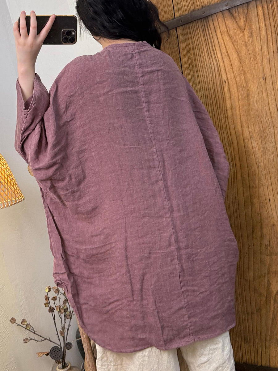 Damen Herbst Retro Reine Farbe Leinen Stehkragen Hemd