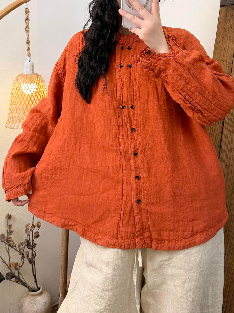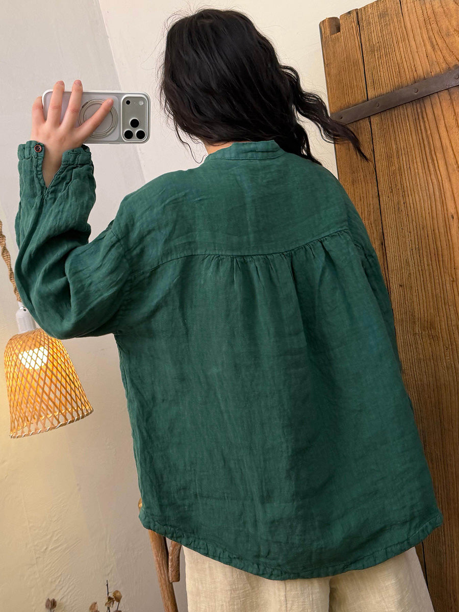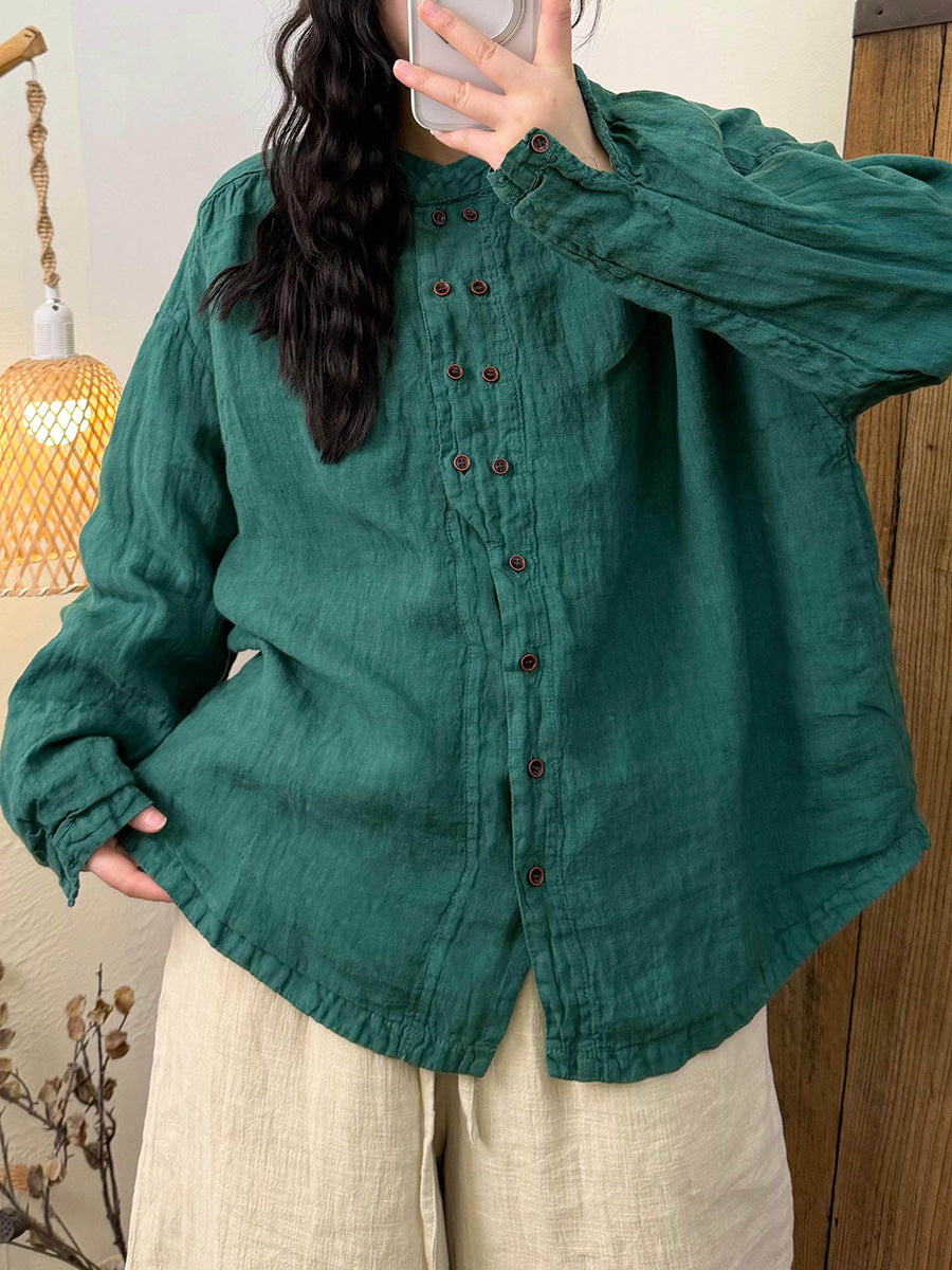 Damen Herbst Retro Leinen Stehkragenhemd in Unifarben