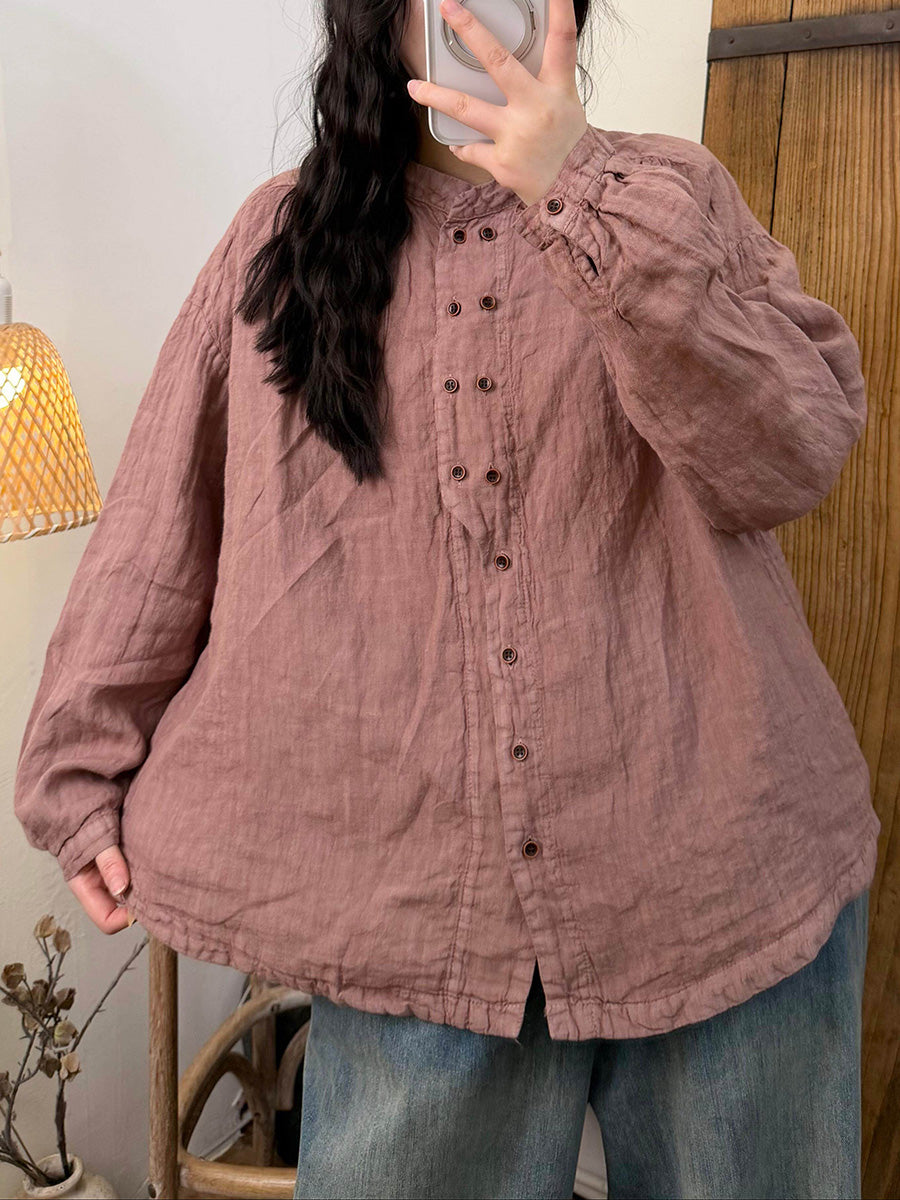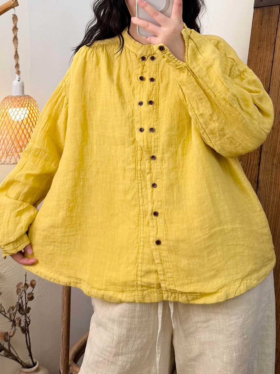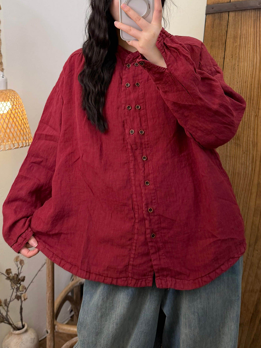 Damen Herbst Retro Leinen Stehkragenhemd in Unifarben
