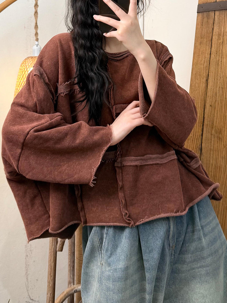 Damen Herbst Retro Reine Farbe Gespleißtes Baumwoll-O-Ausschnitt-Shirt