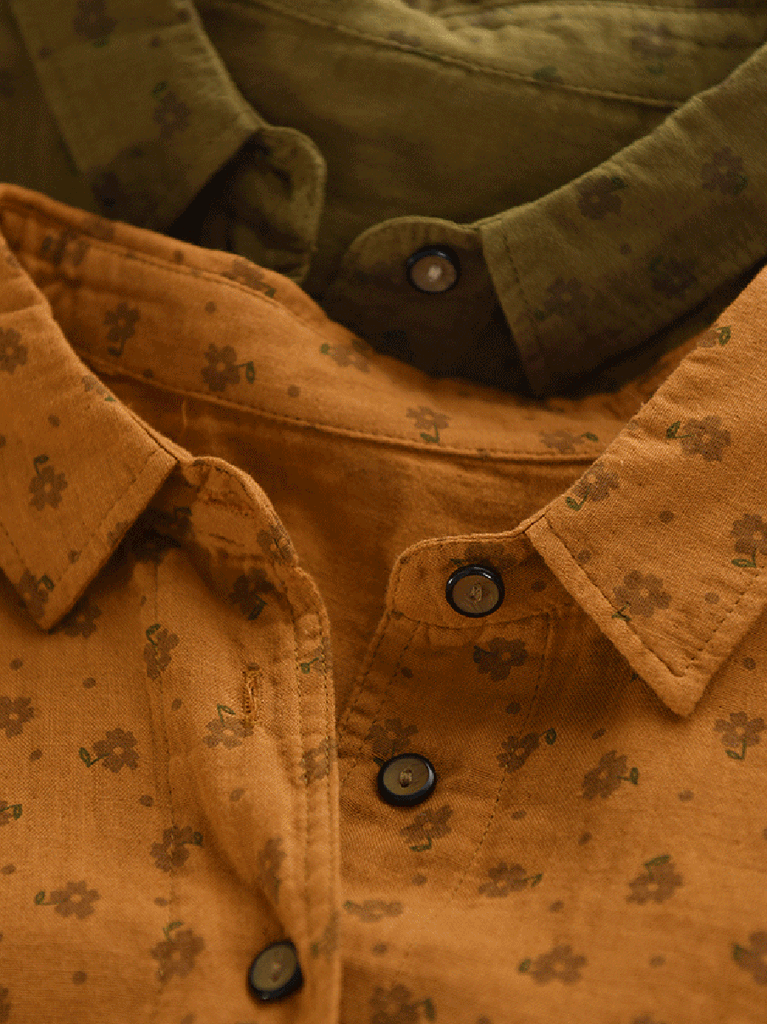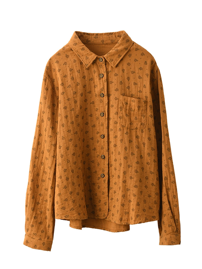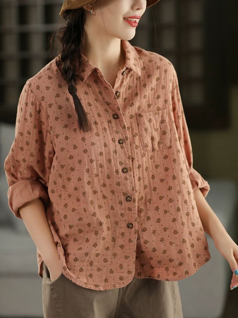 Damen Herbst Vintage Floral 100% Baumwolle Umlegekragen Hemd