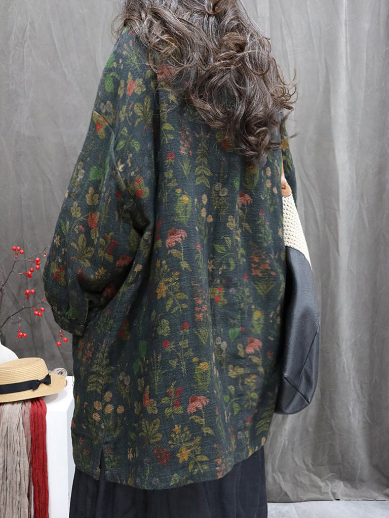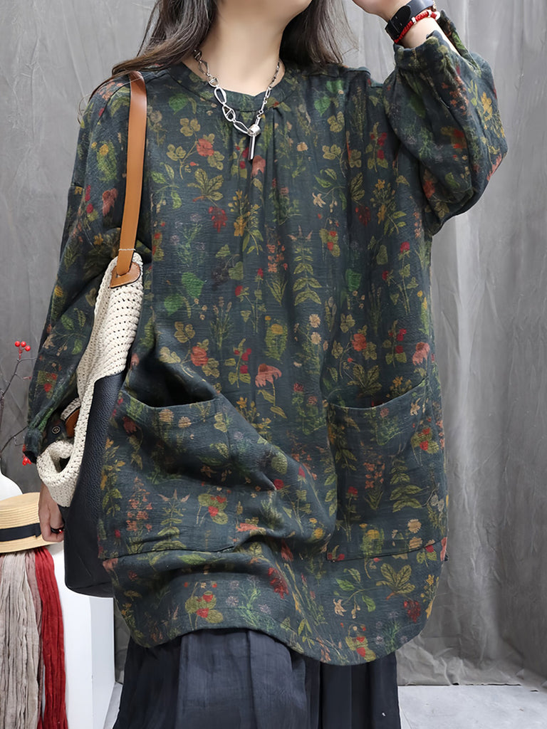 Damen Herbst Vintage Blumen Leinen O-Ausschnitt Hemd