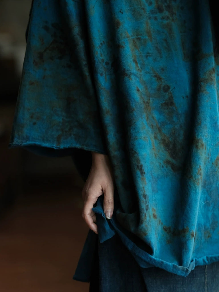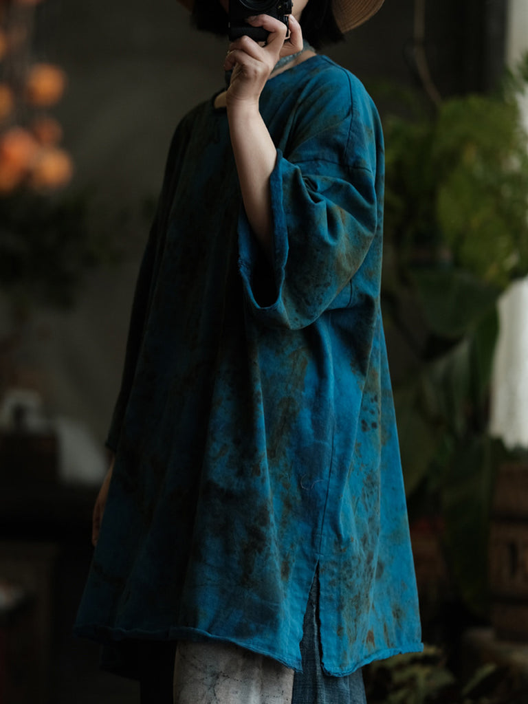 Damen Herbst Vintage O-Ausschnitt Tie-Dye Baumwollhemd