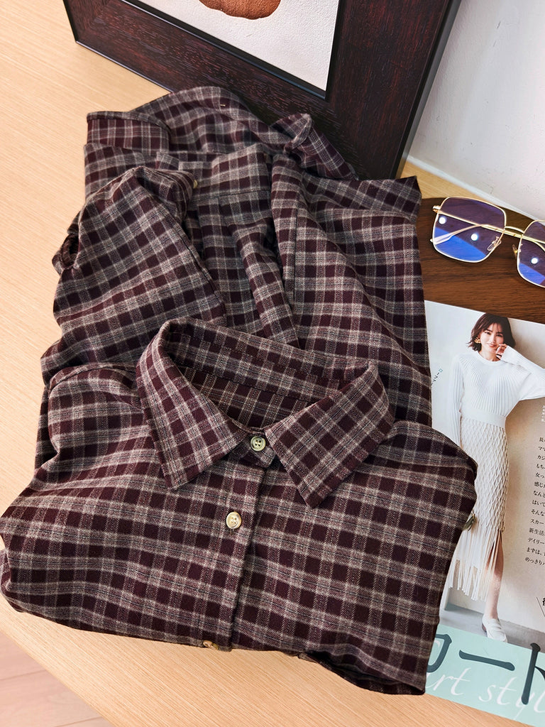Damen Herbst Vintage Plaid Umlegekragen Hemd