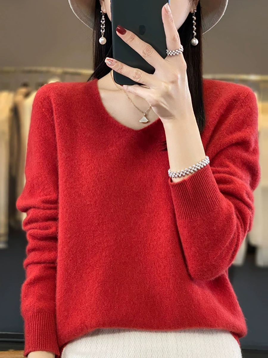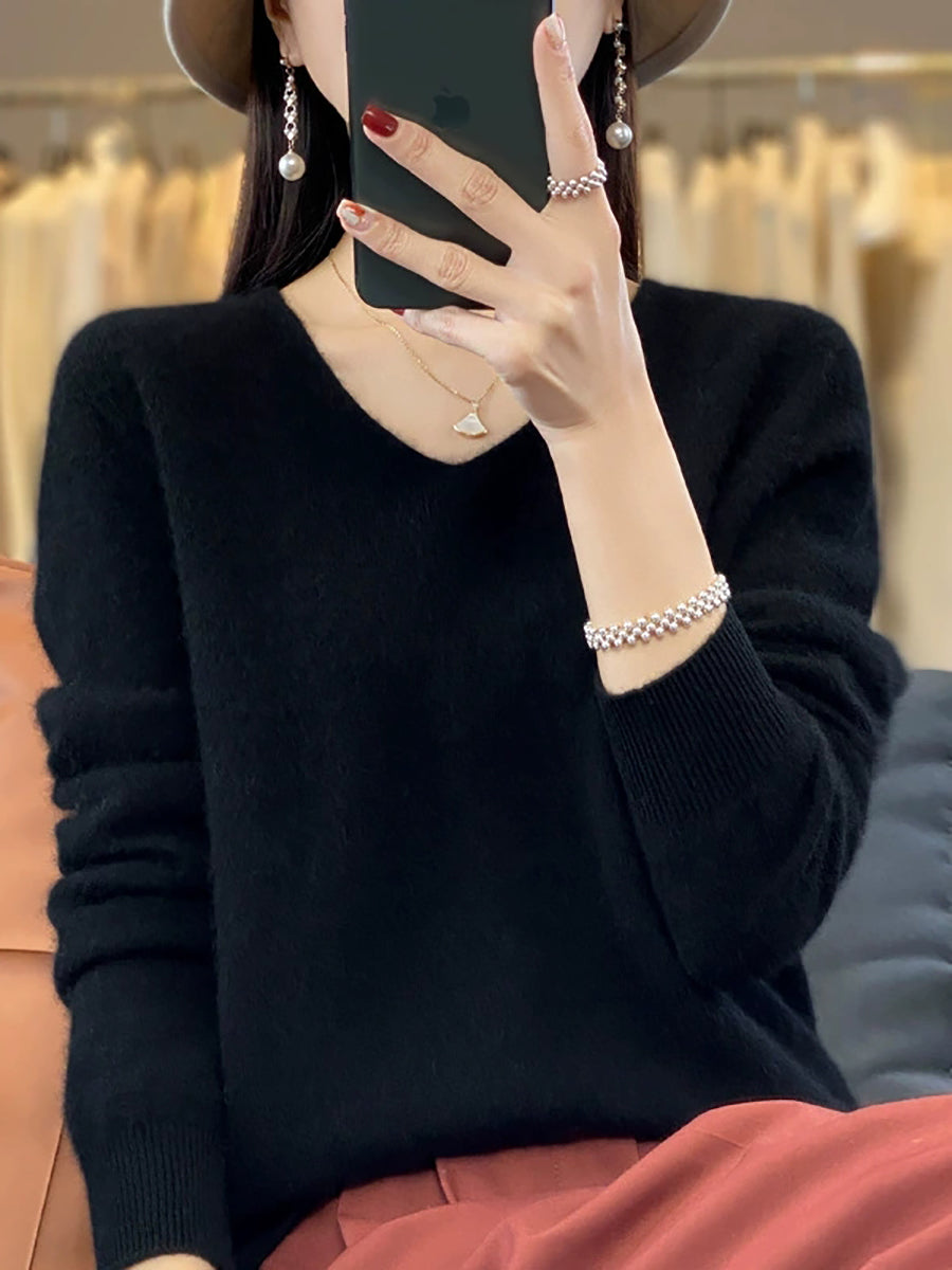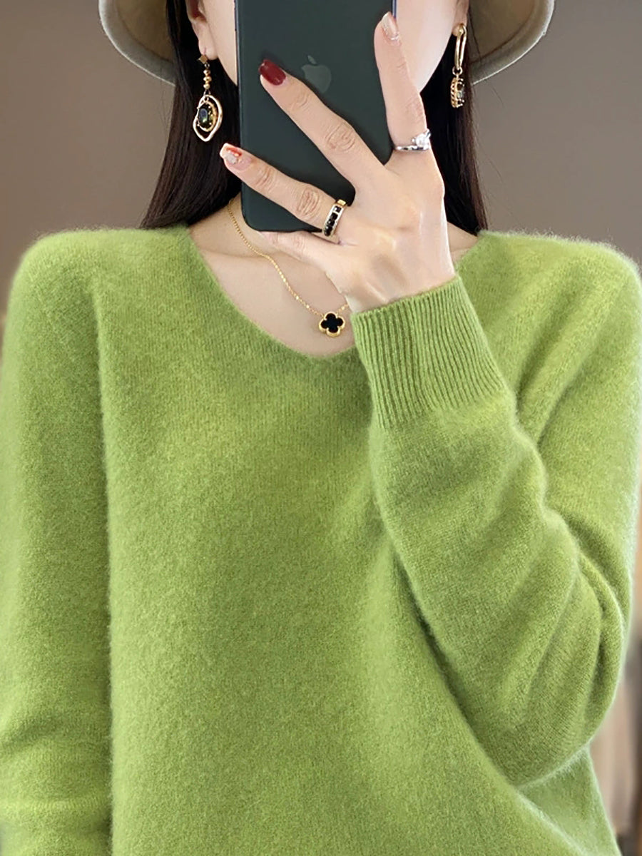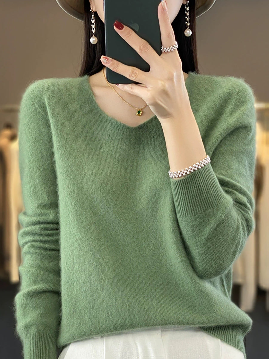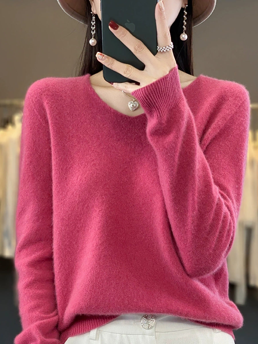 Lässiger Damen-Frühlingspullover aus Wolle in Unifarben mit V-Ausschnitt