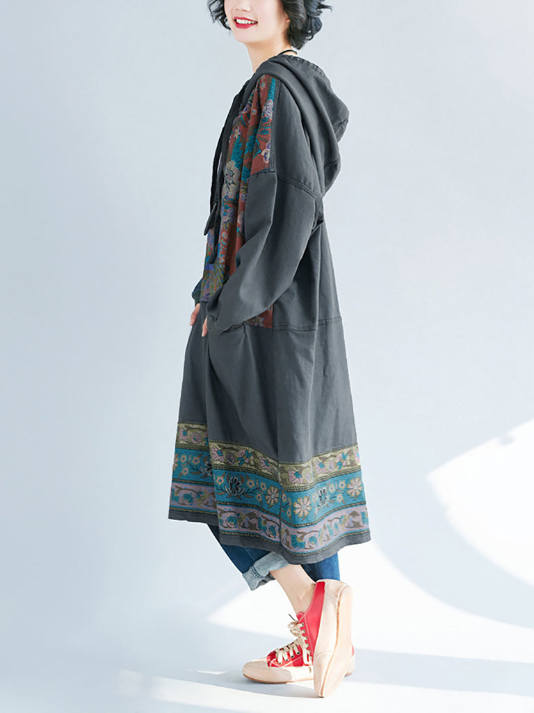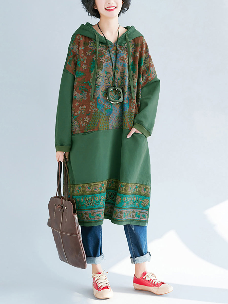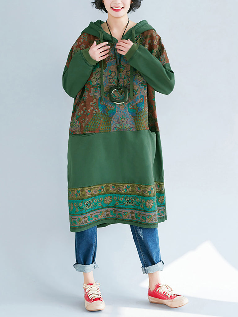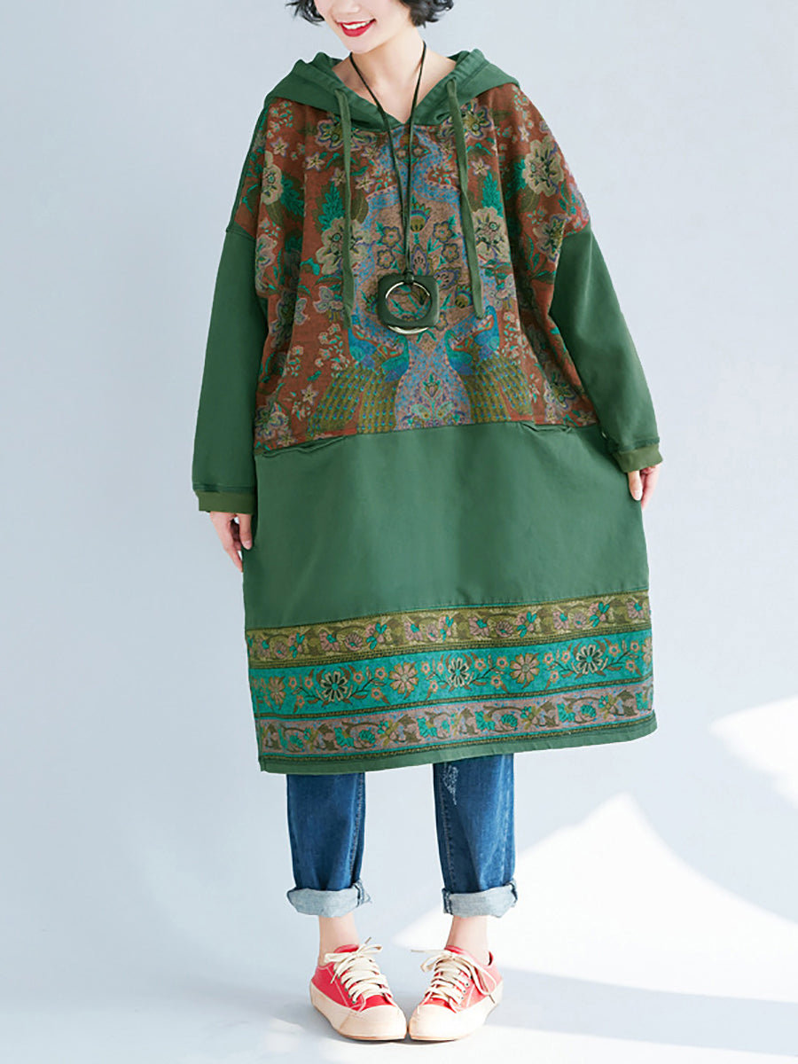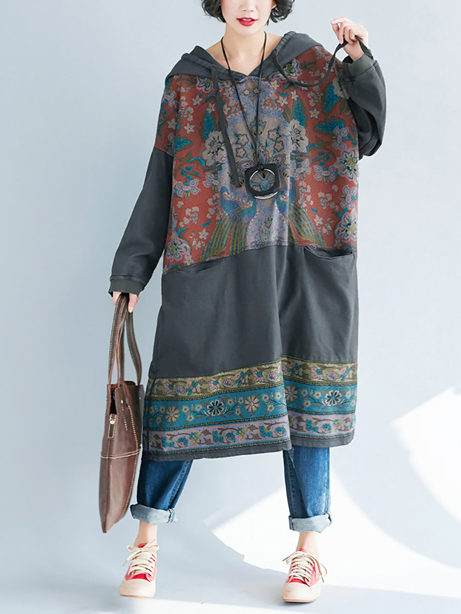 Damen-Kleid mit Ethno-Blumenmuster und langen Taschen und Kapuze