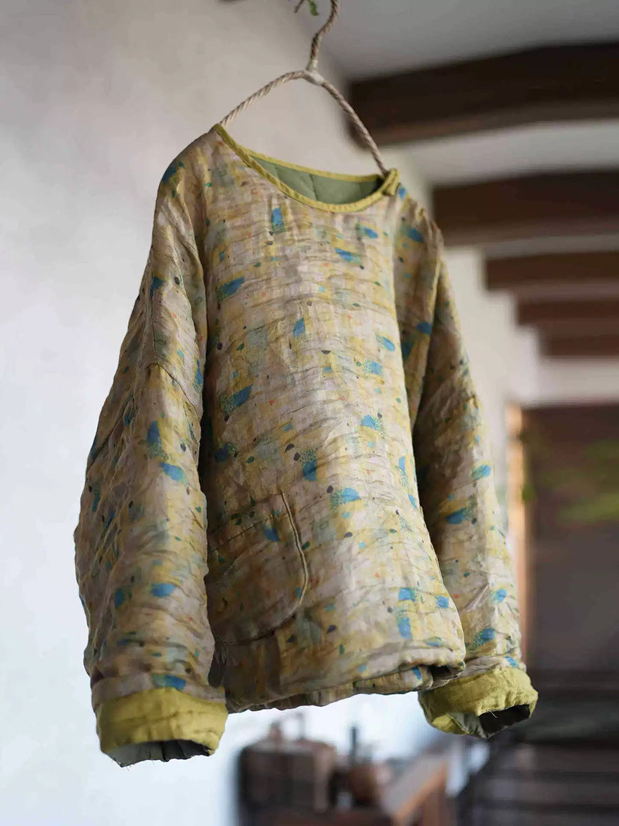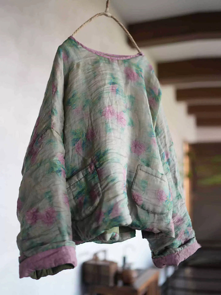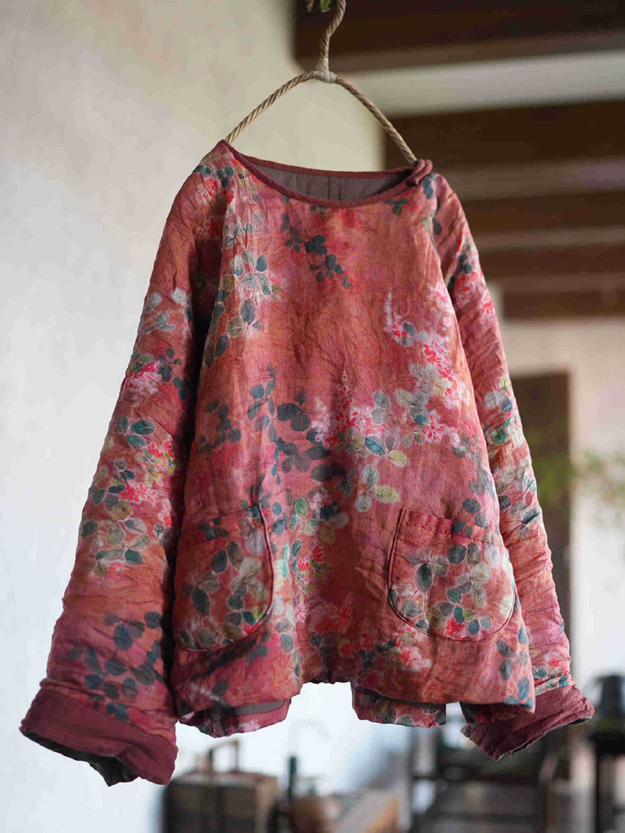 Damen Retro-Blumenmuster Ramie-Wattierter Rundhalsmantel