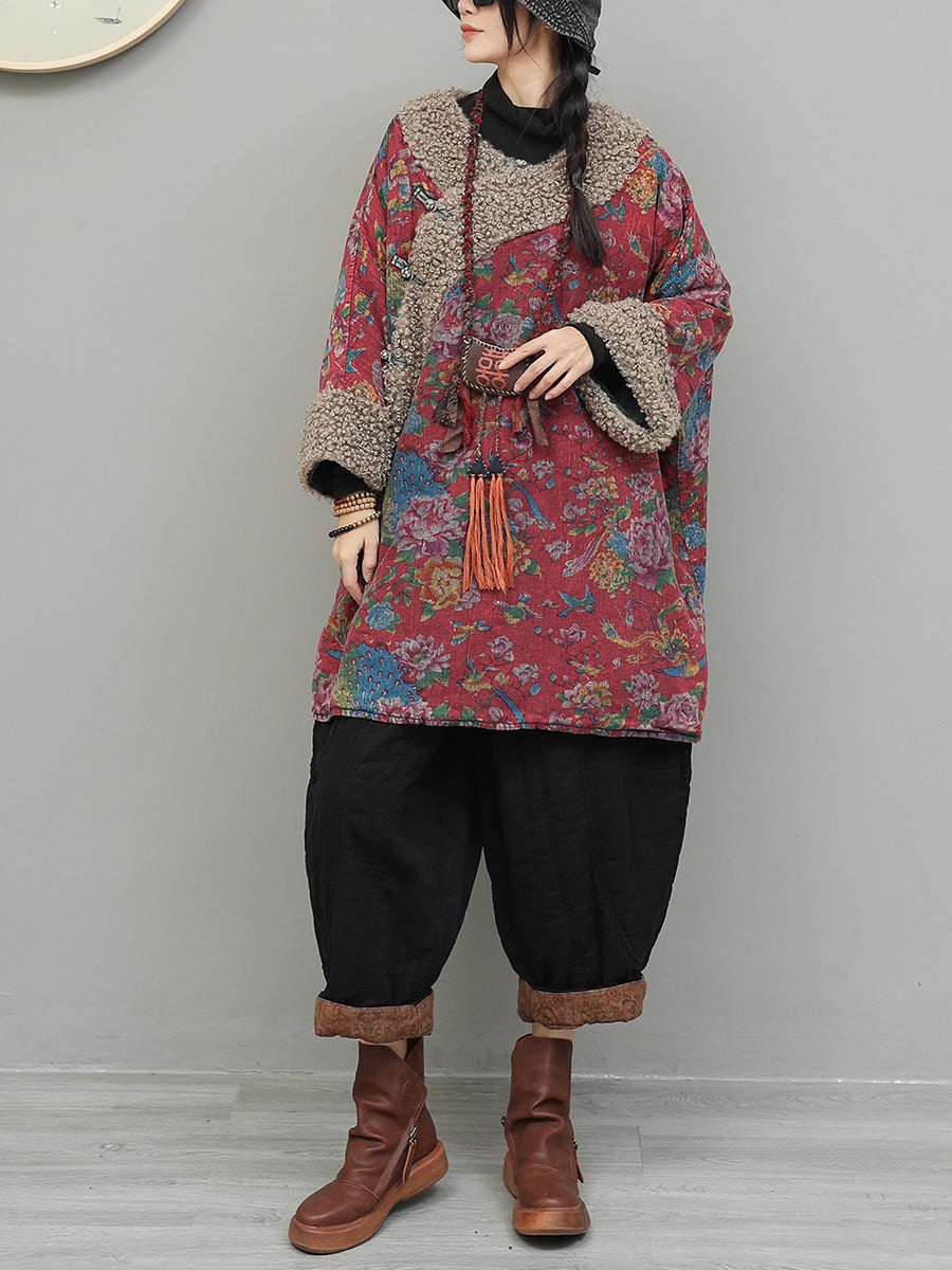 Damen-Retro-Mantel mit Blumenmuster, Fleece- und Baumwollmischung, Rundhalsausschnitt