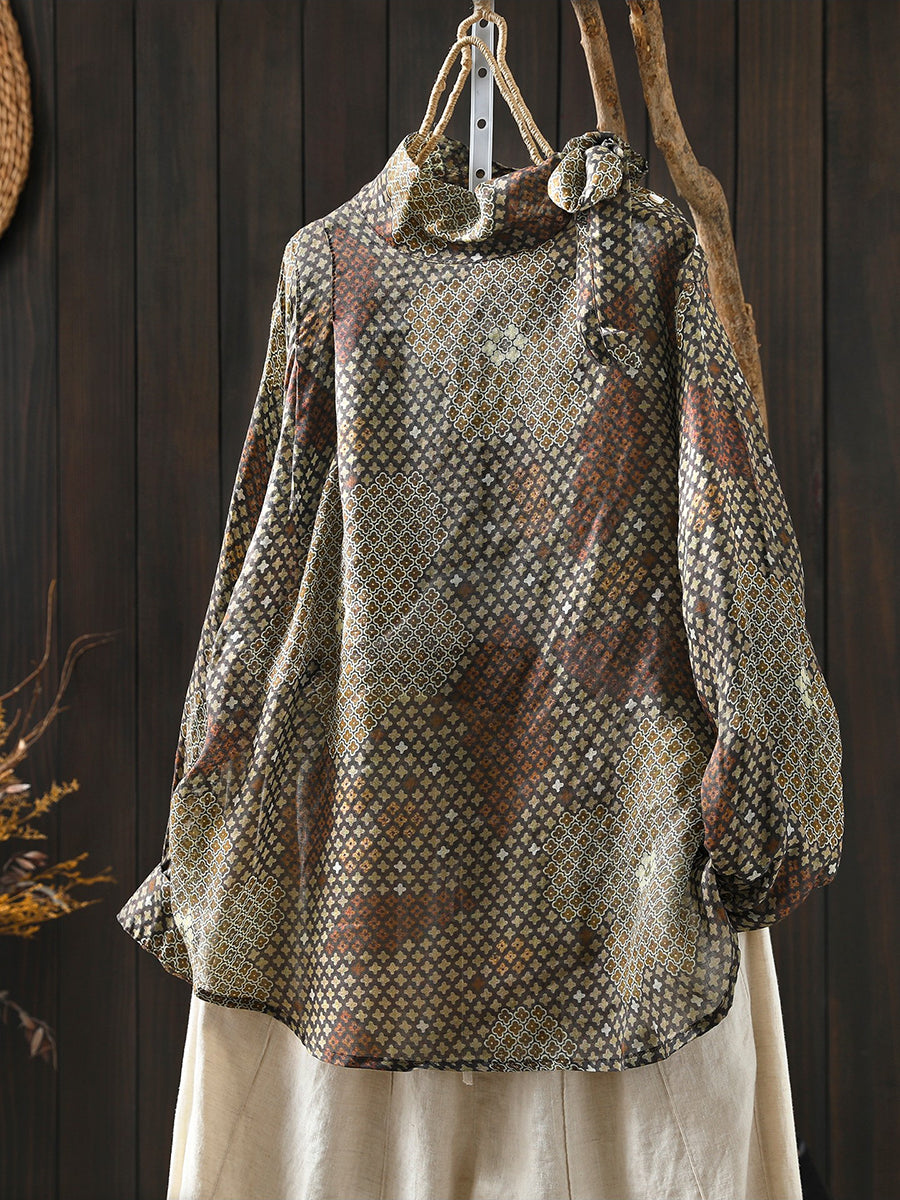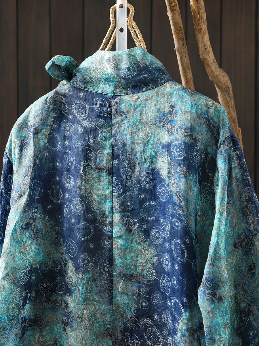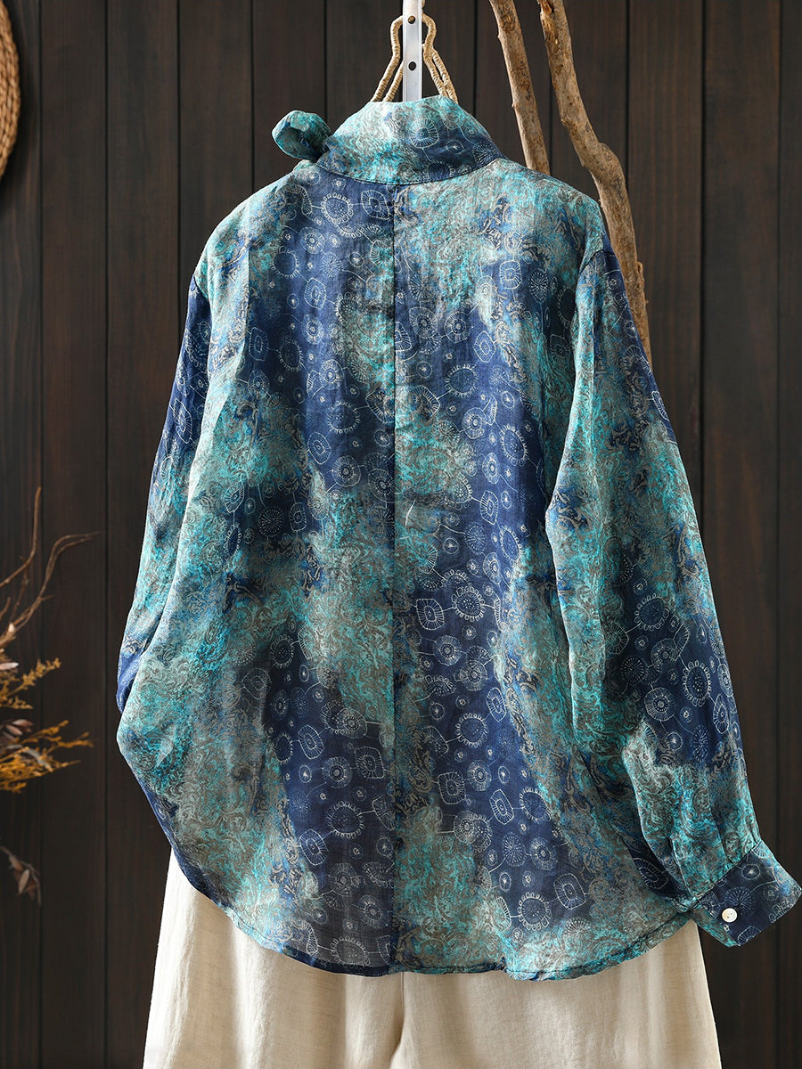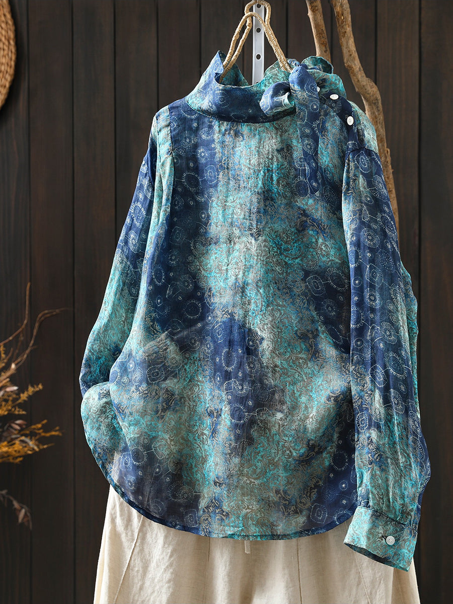 Damenbluse mit Stehkragen, frühlingshaft, mit künstlerischem Blumenmuster, 100 % Ramie.