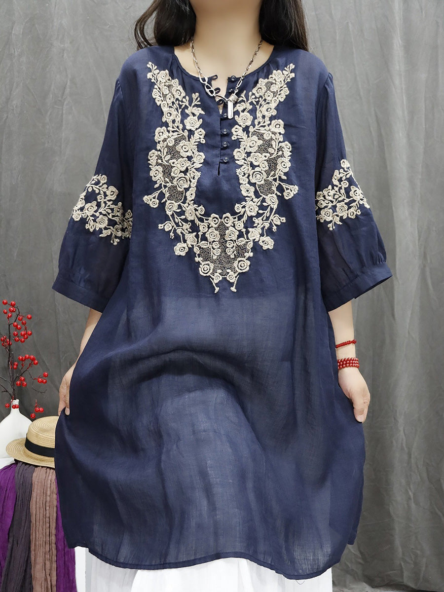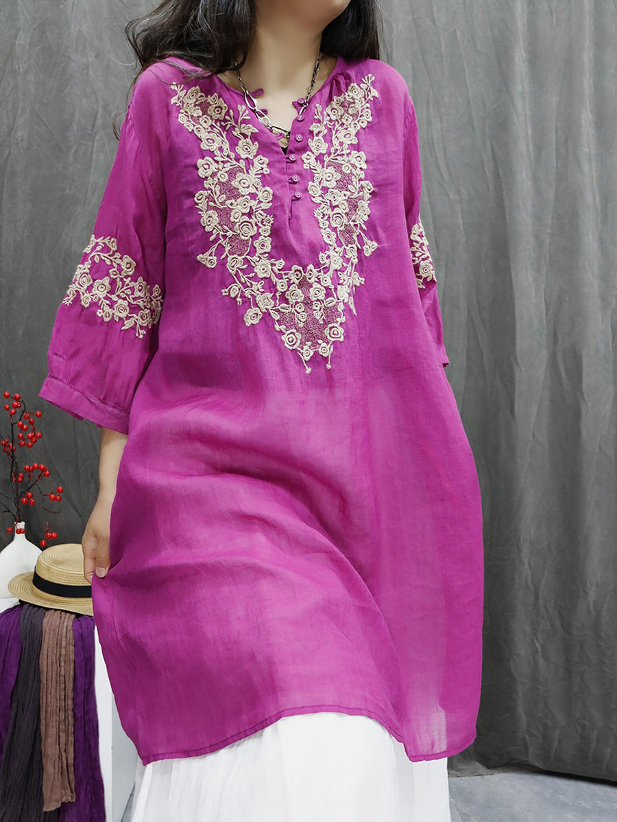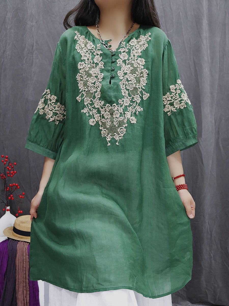 Damen Frühlingsbluse mit kunstvoller Blumenstickerei aus 100 % Ramie, V-Ausschnitt