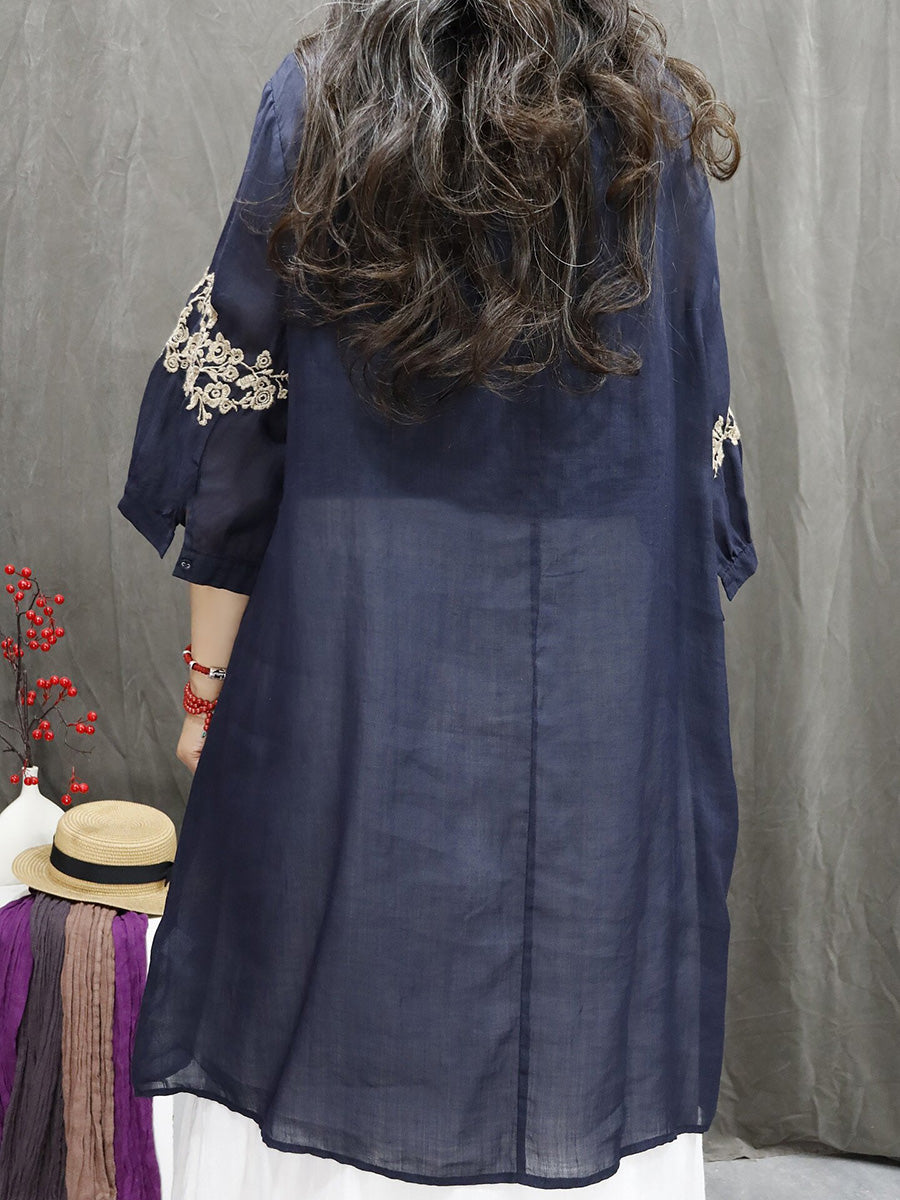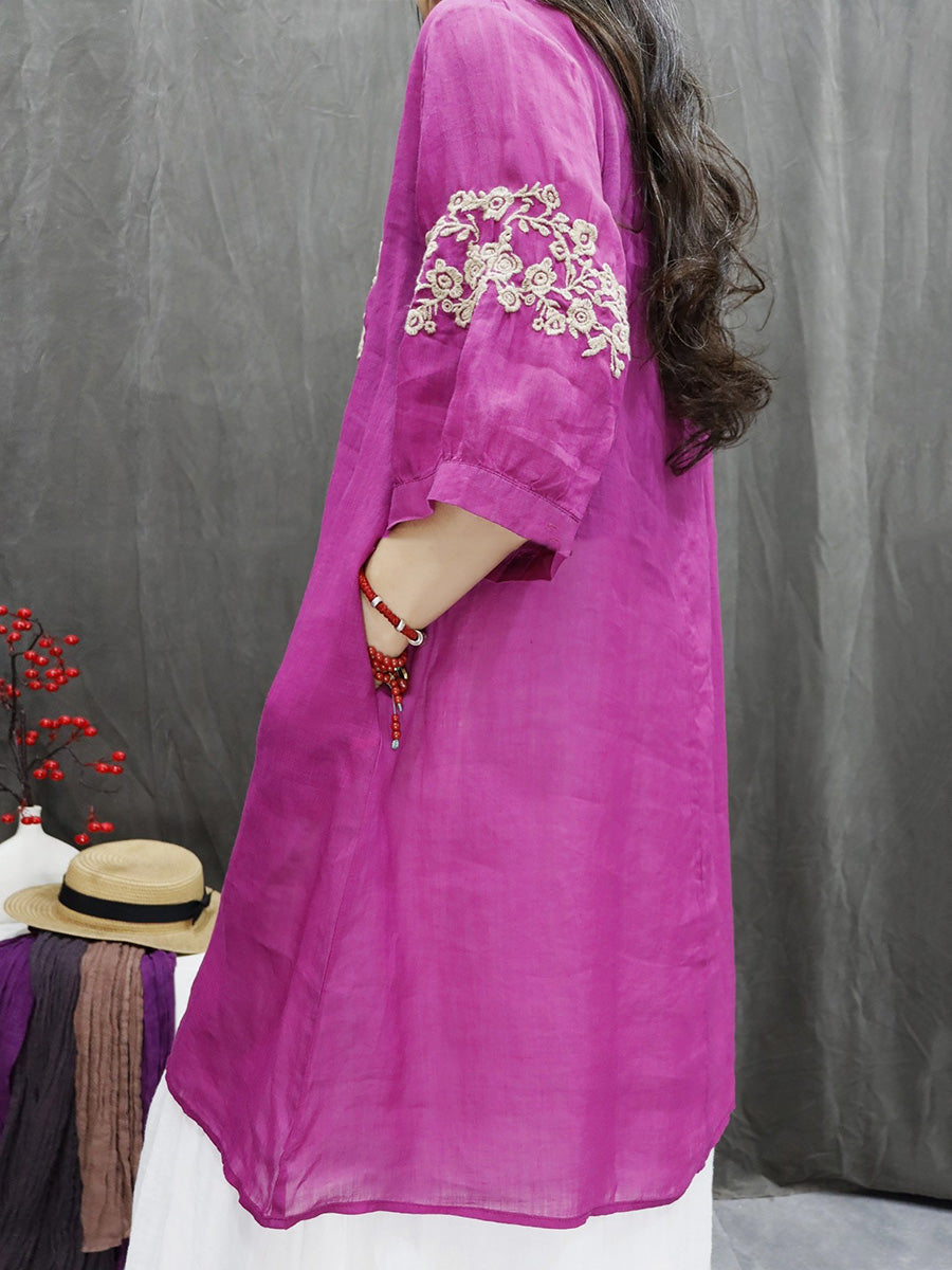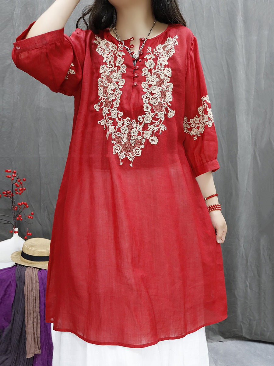 Damen Frühlingsbluse mit kunstvoller Blumenstickerei aus 100 % Ramie, V-Ausschnitt