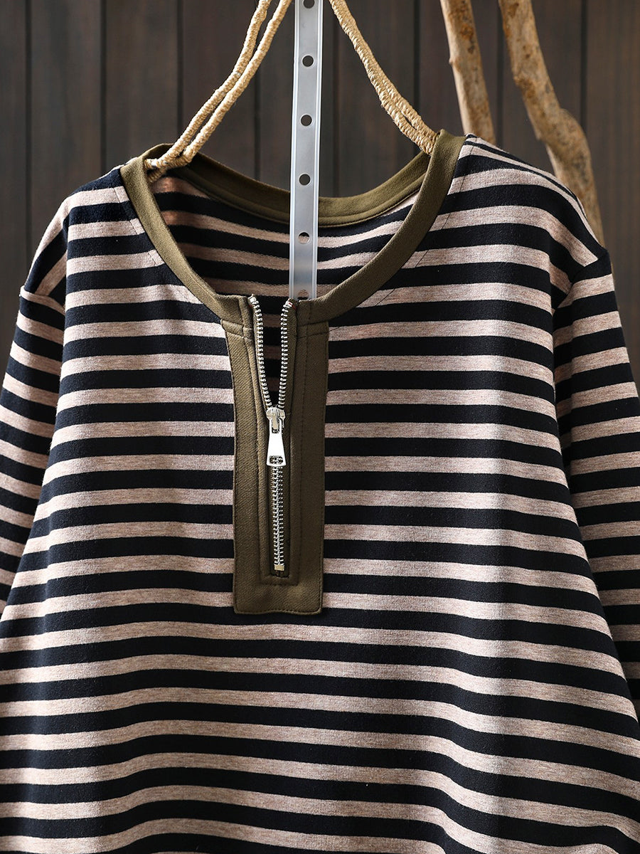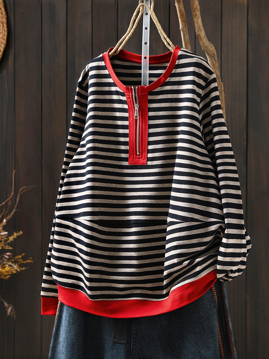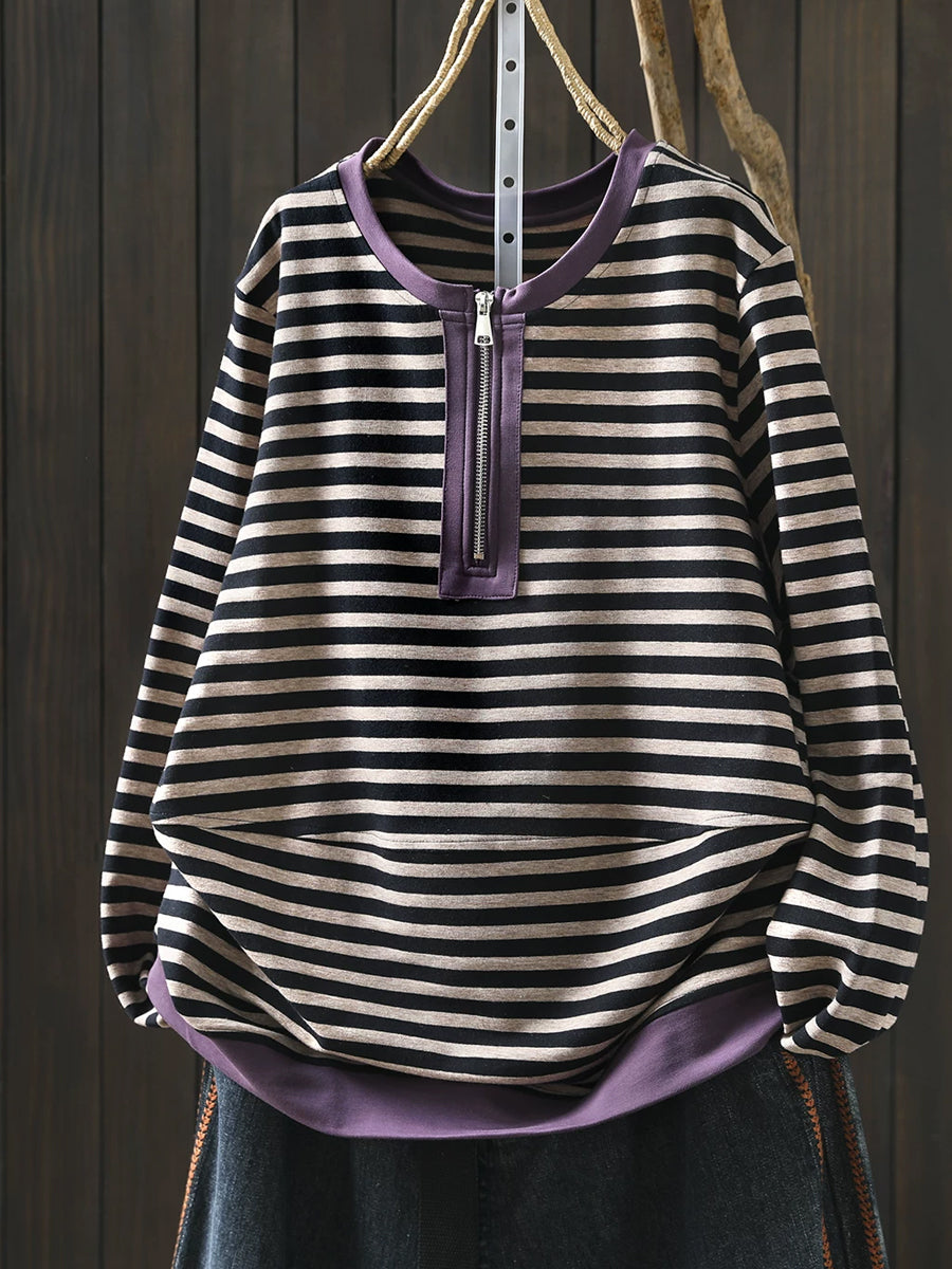 Damen-Frühlingsbluse aus Baumwolle mit Streifenmuster und Rundhalsausschnitt