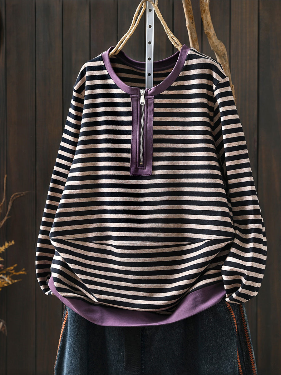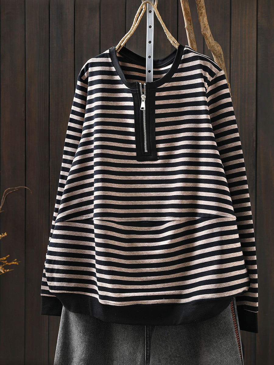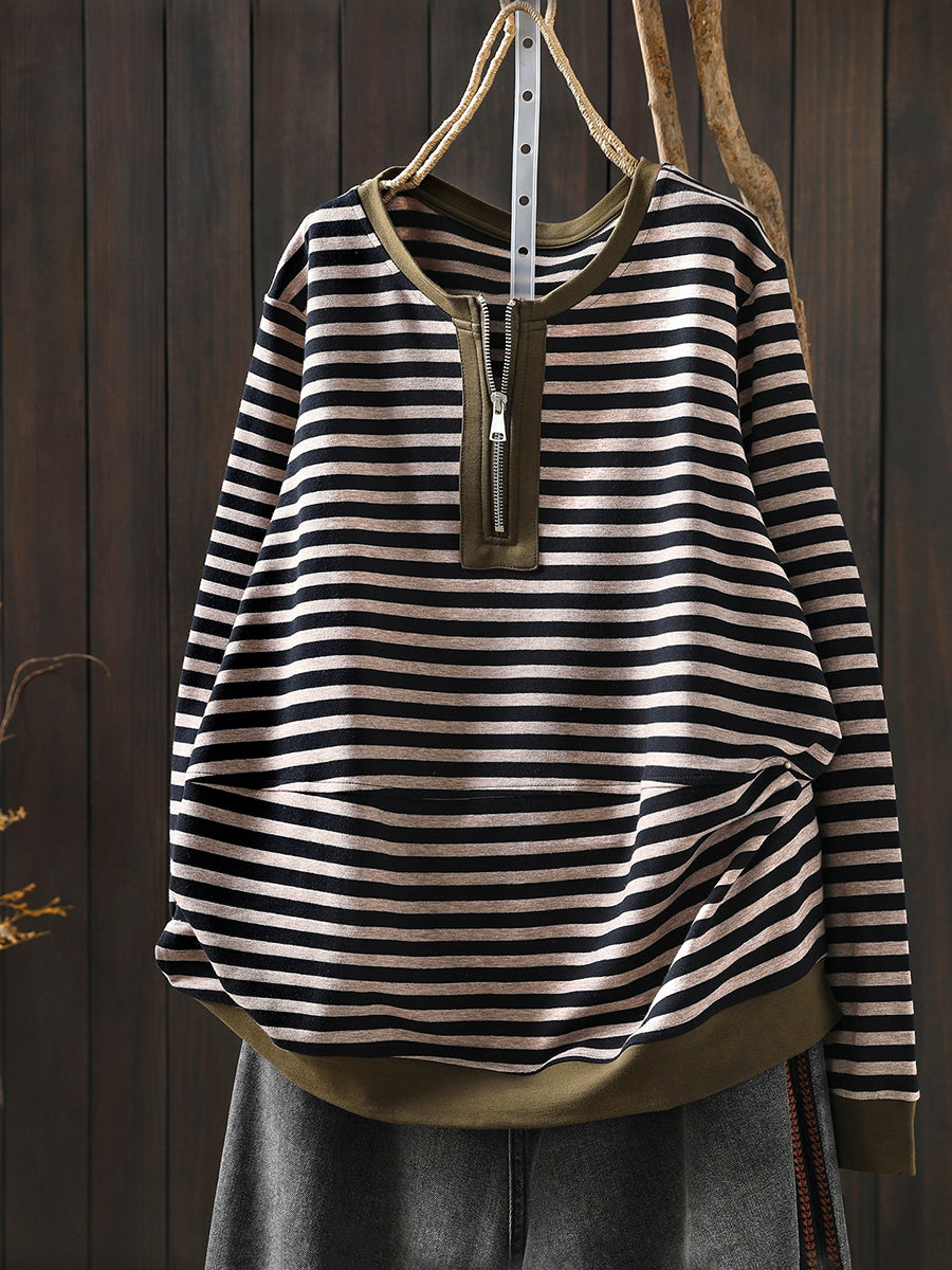 Damen-Frühlingsbluse aus Baumwolle mit Streifenmuster und Rundhalsausschnitt