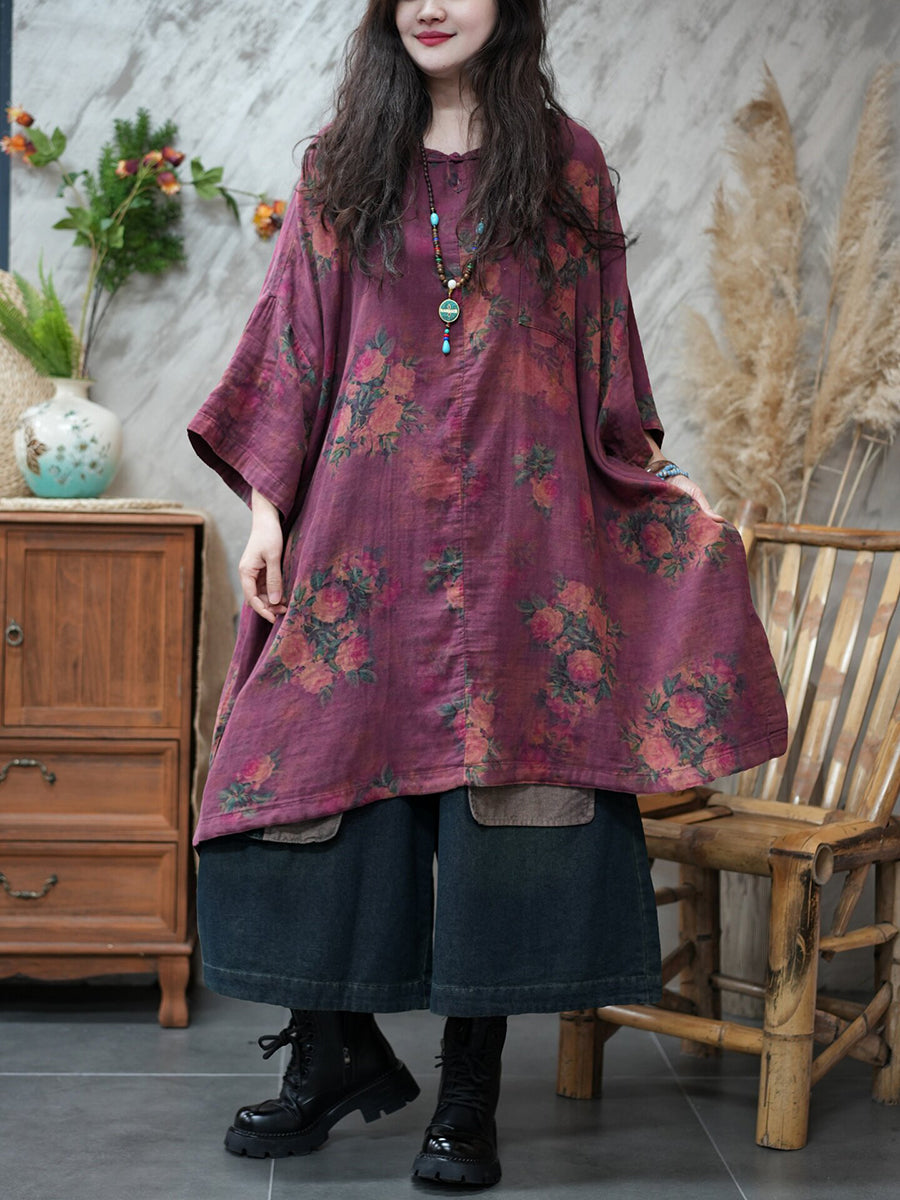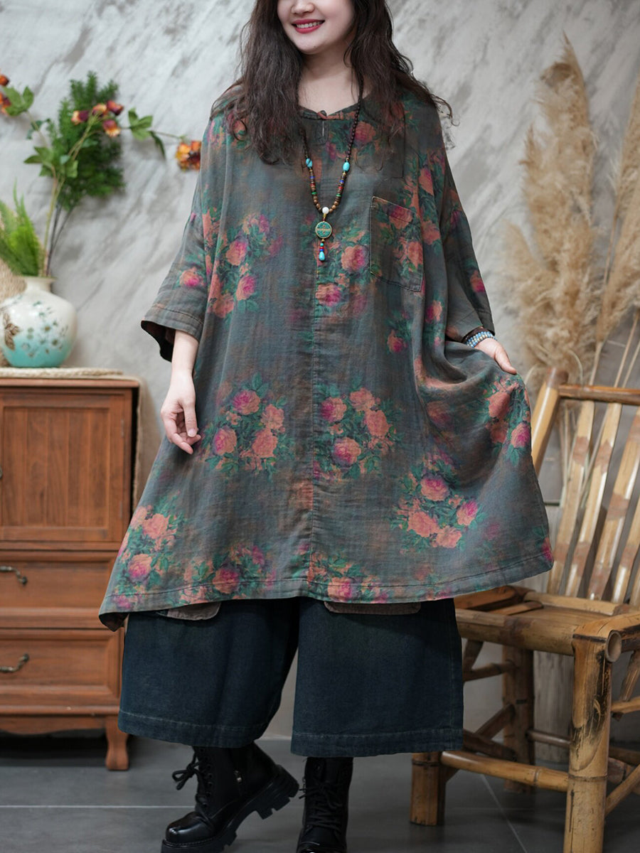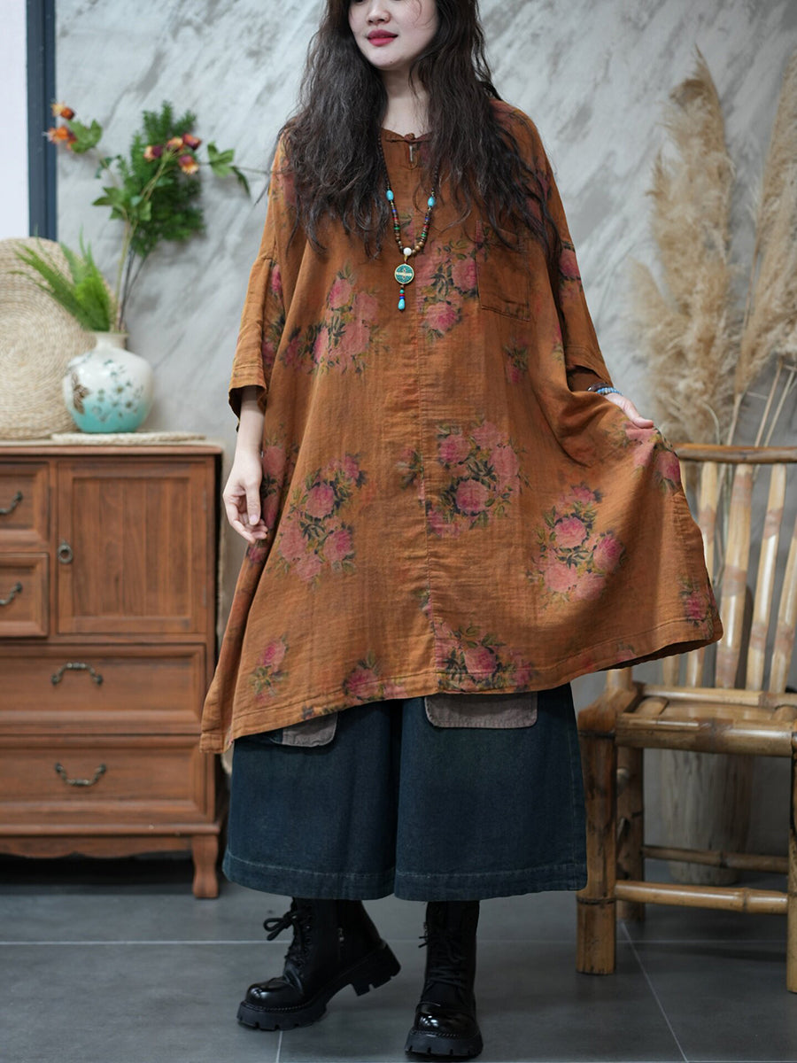 Damen Sommer Vintage Blumen Rundhals Langarmshirt