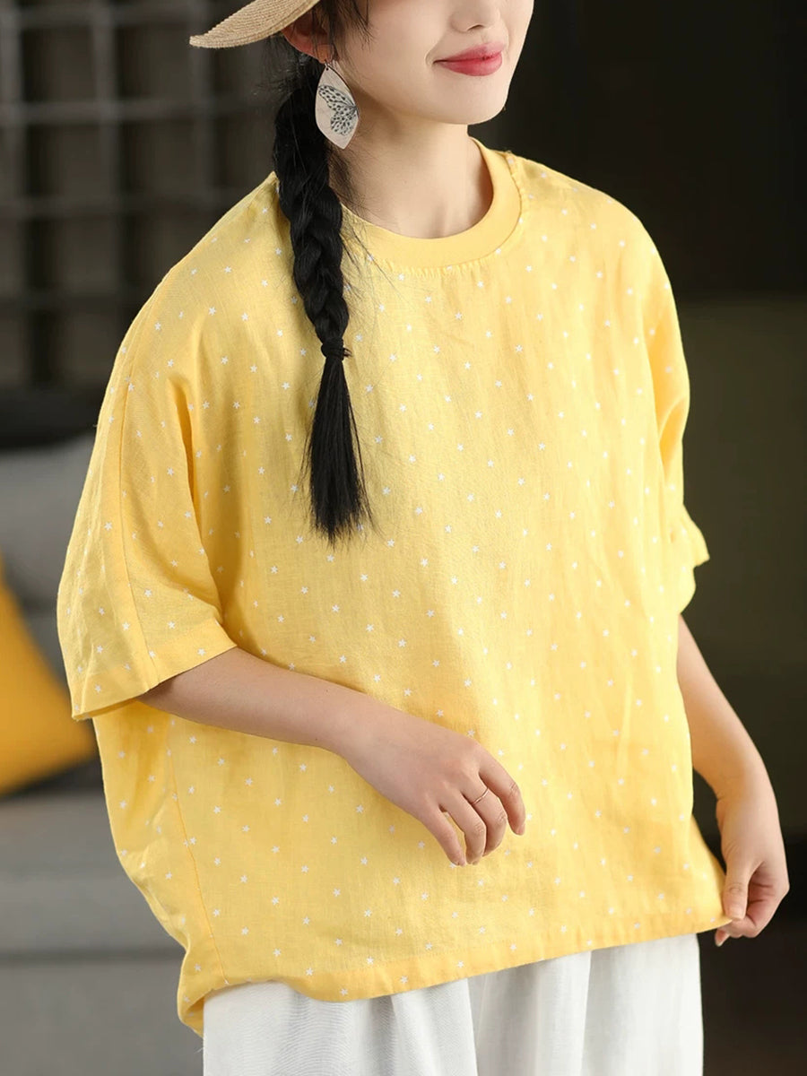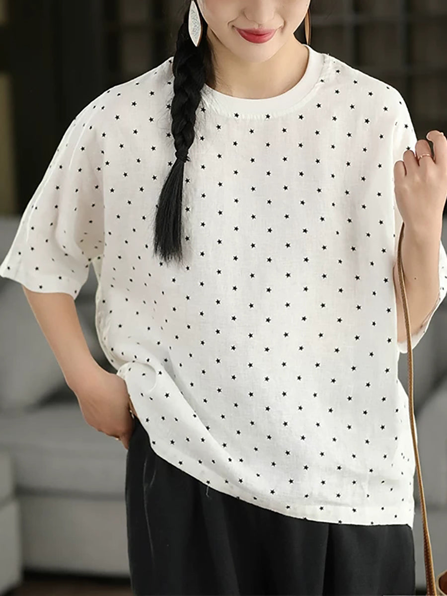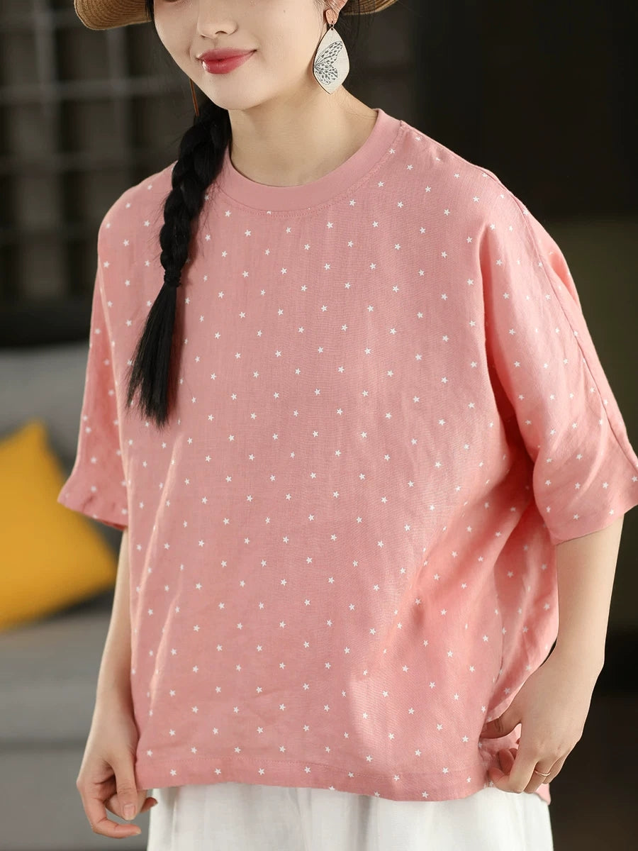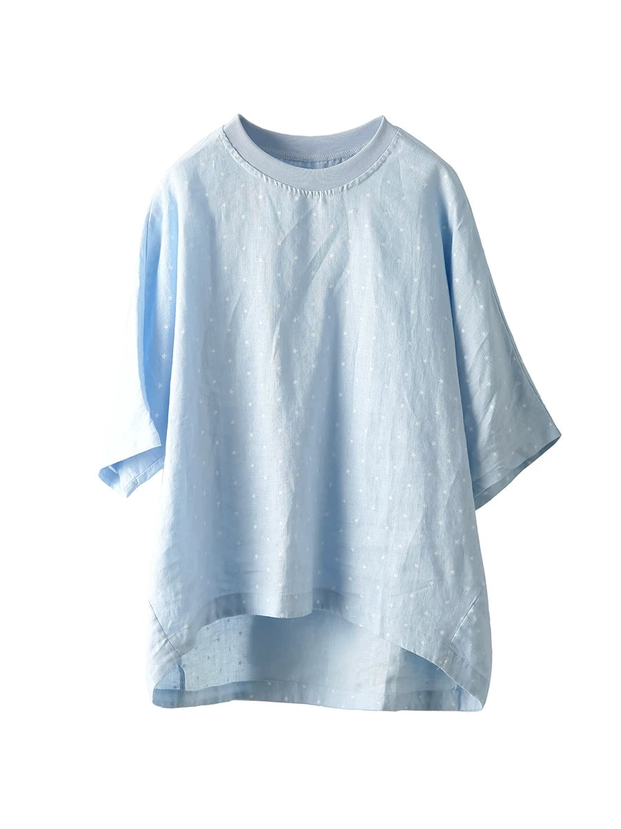 Sommerbluse für Damen mit künstlerischem Punktmuster und Rundhalsausschnitt aus 100 % Leinen.