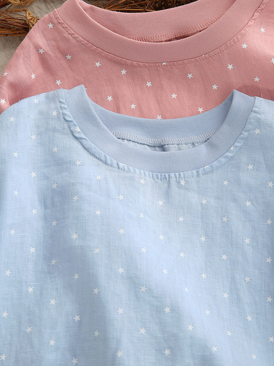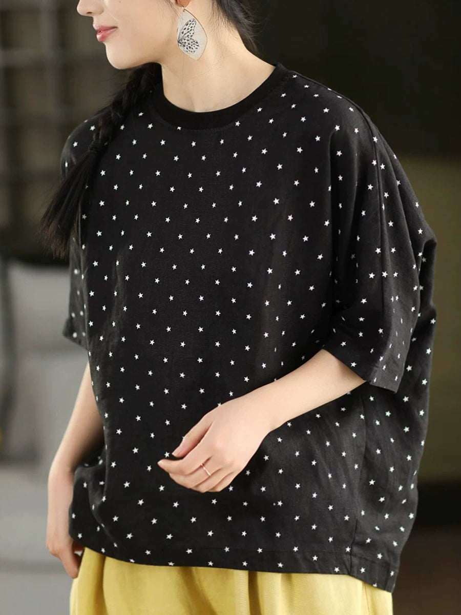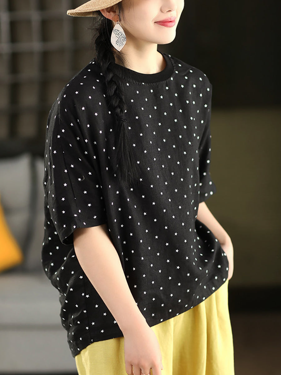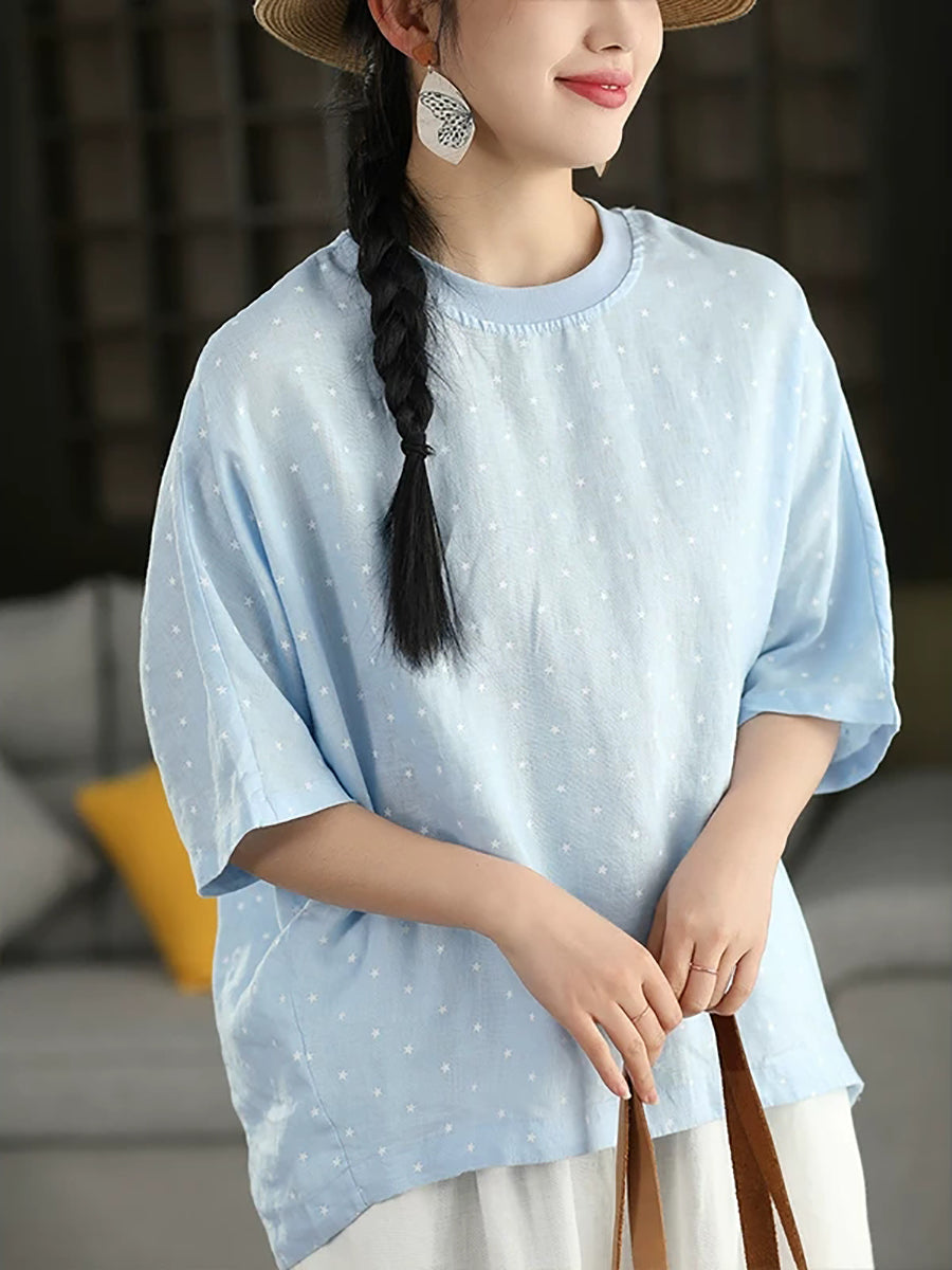 Sommerbluse für Damen mit künstlerischem Punktmuster und Rundhalsausschnitt aus 100 % Leinen.