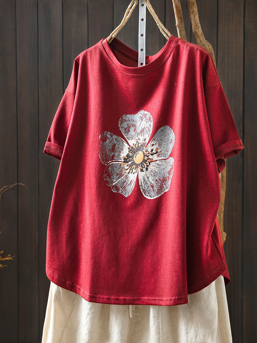 Damen Sommer Freizeitbluse mit Blumenmuster und Rundhalsausschnitt