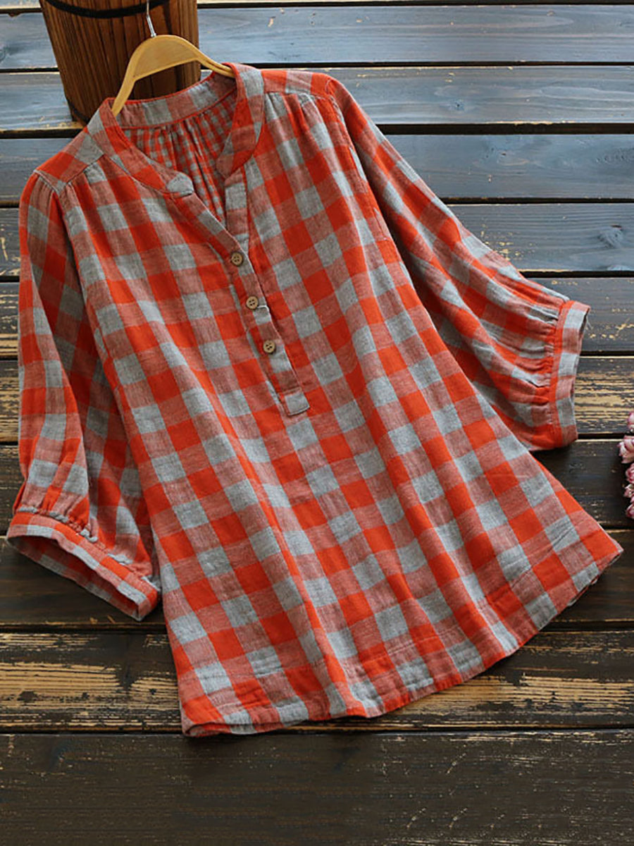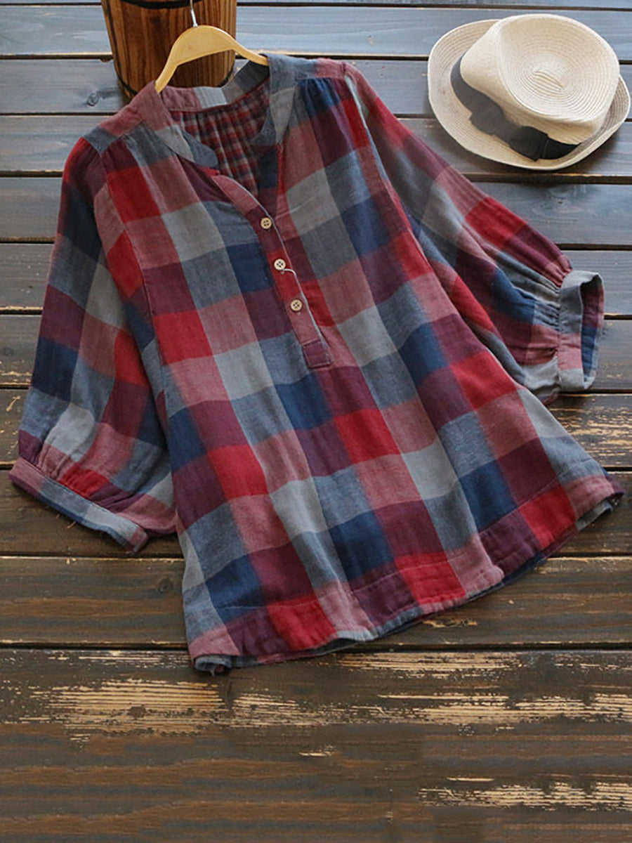 Damen Sommer Freizeit Kariertes Dünnes 100% Baumwollhemd