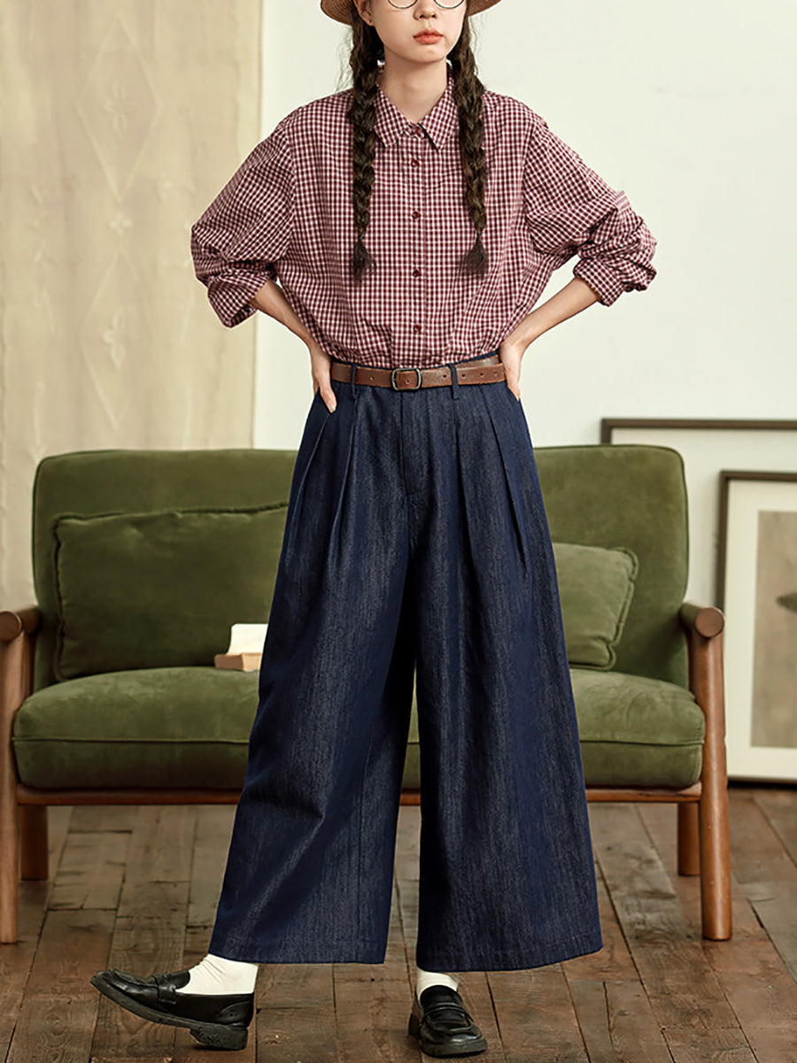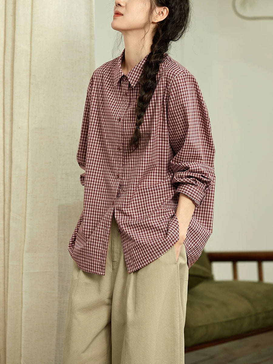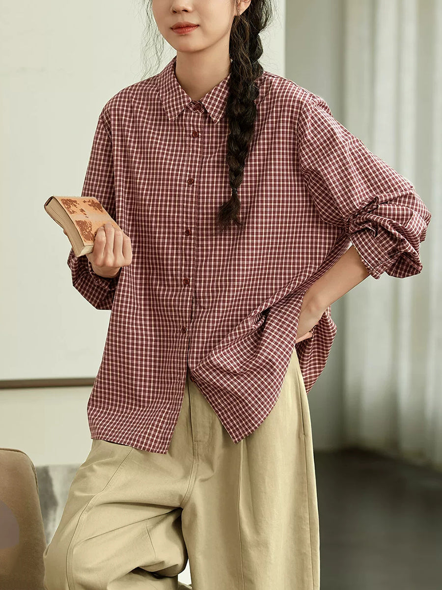 Sommerbluse für Damen mit Karomuster und Umlegekragen aus 100 % Baumwolle