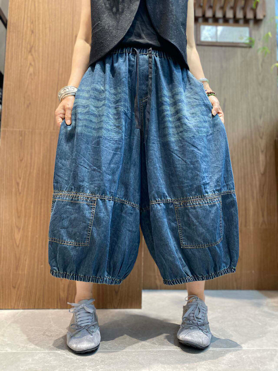 Damen Sommer Retro Denim Caprihose mit weitem Bein