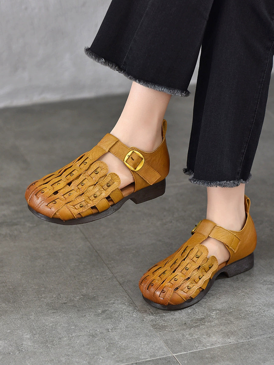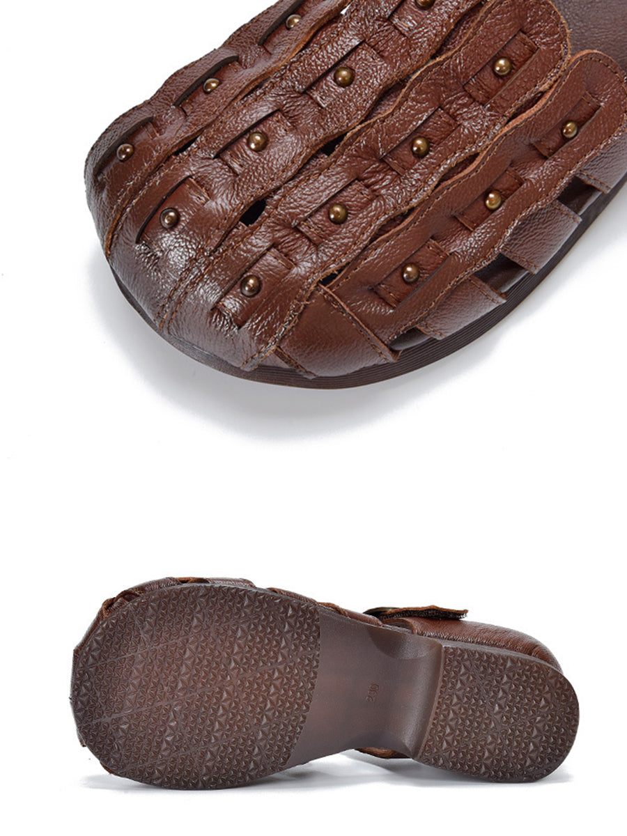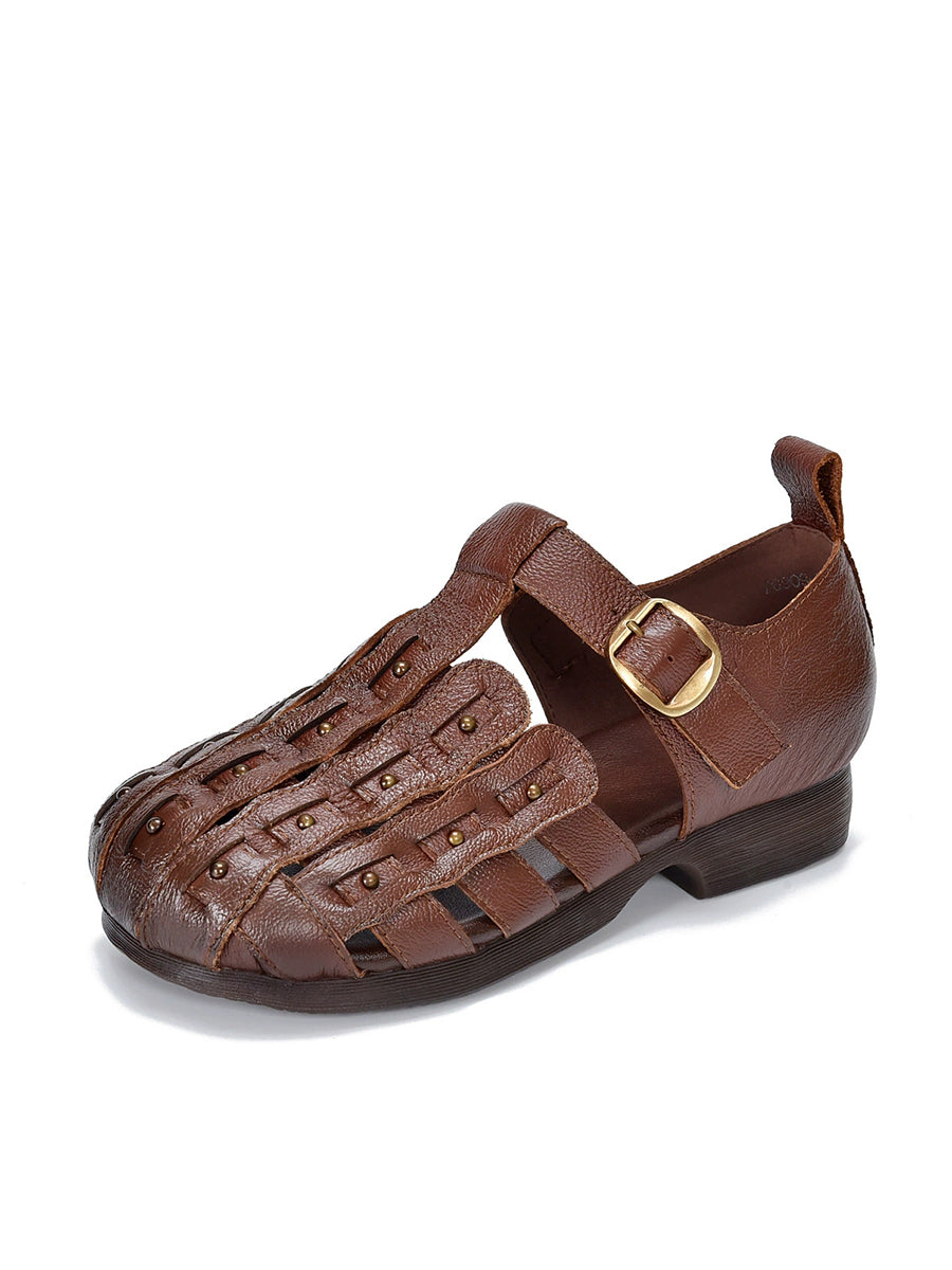 Damen-Sommer-Retro-Sandalen aus echtem Leder mit niedrigem Absatz