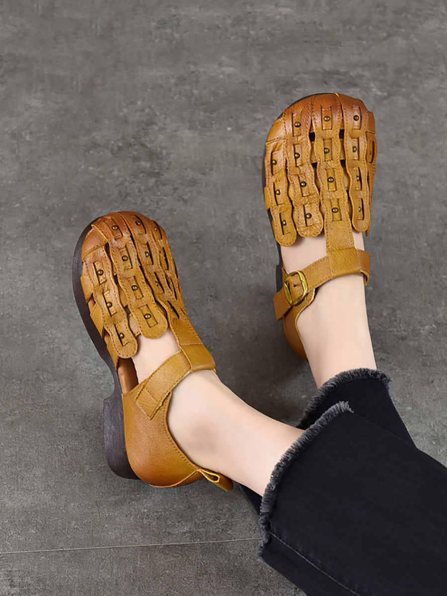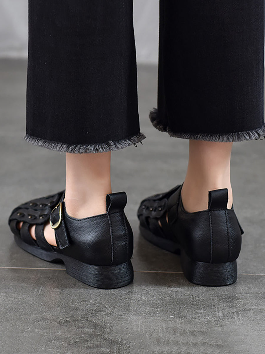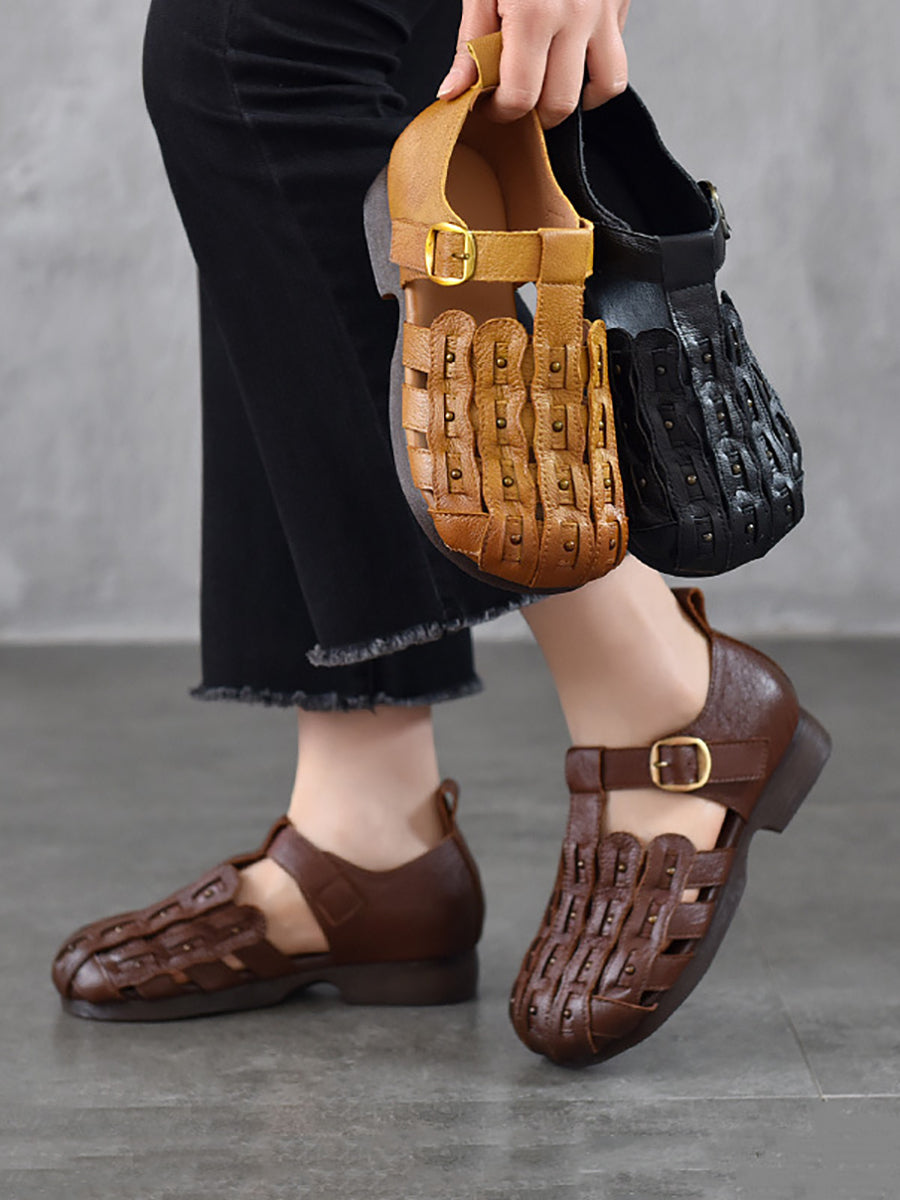 Damen-Sommer-Retro-Sandalen aus echtem Leder mit niedrigem Absatz