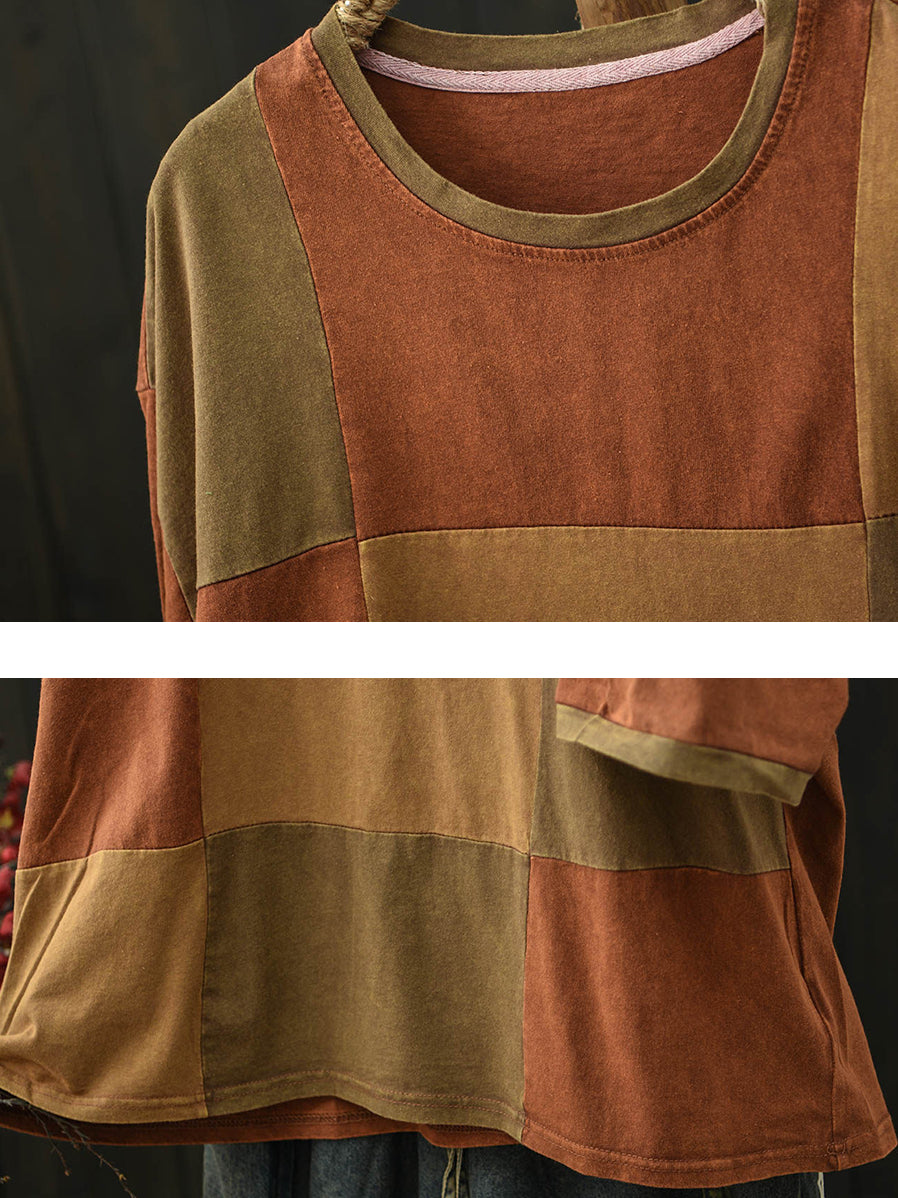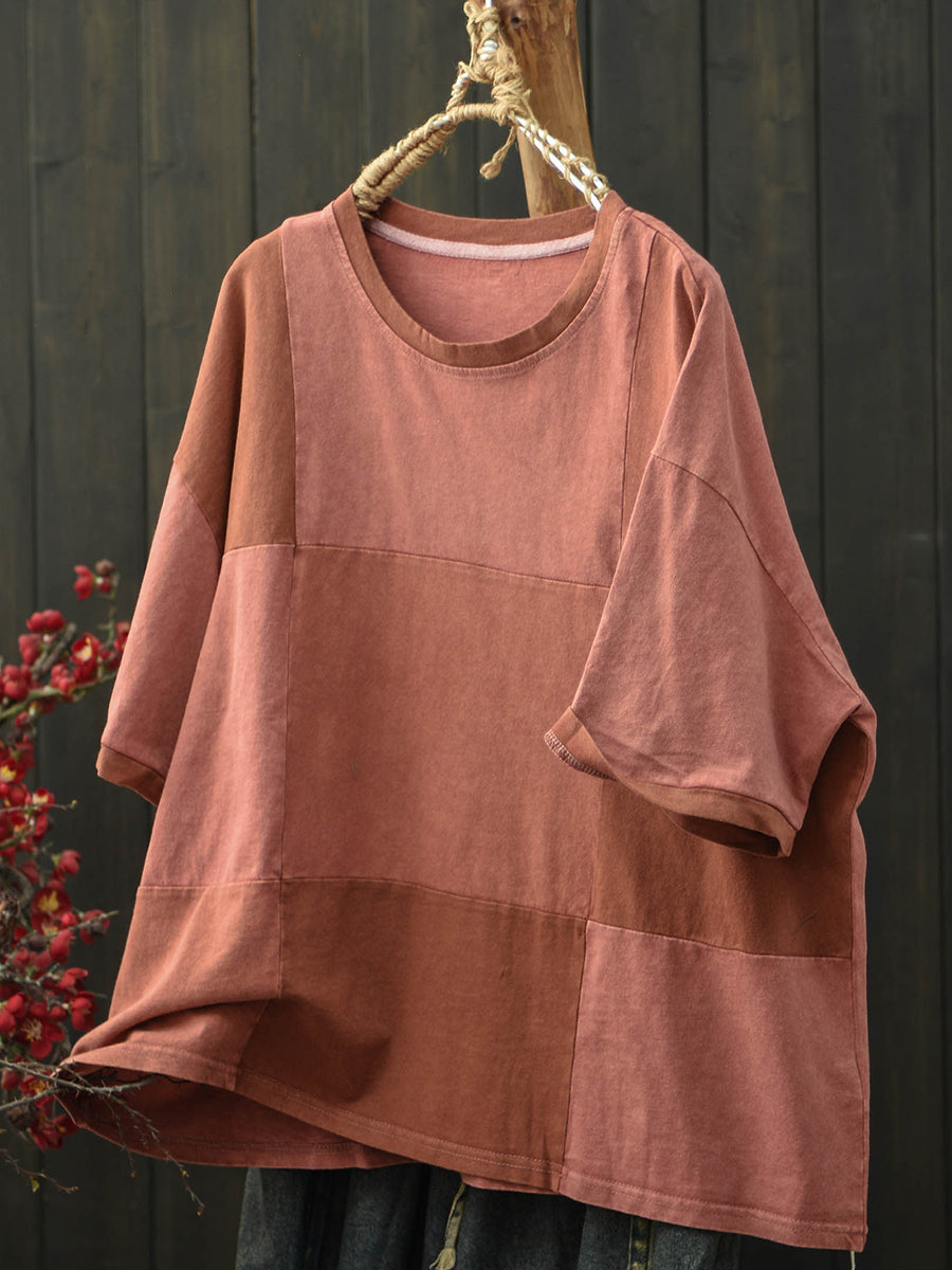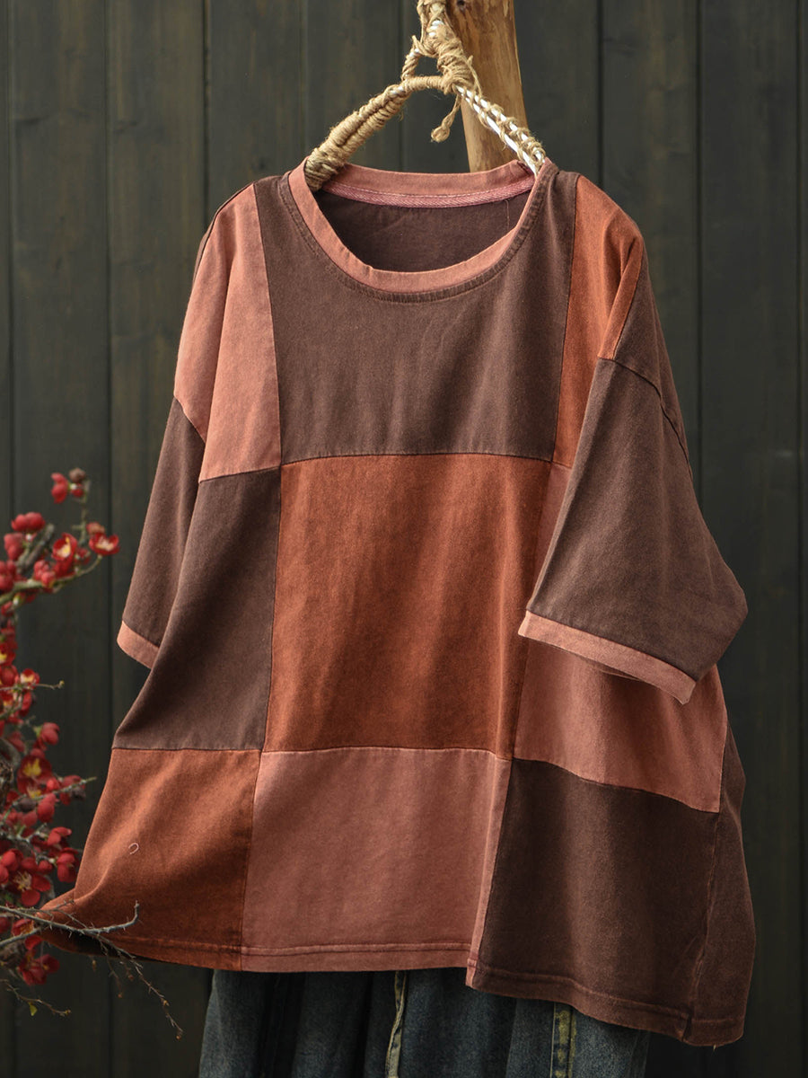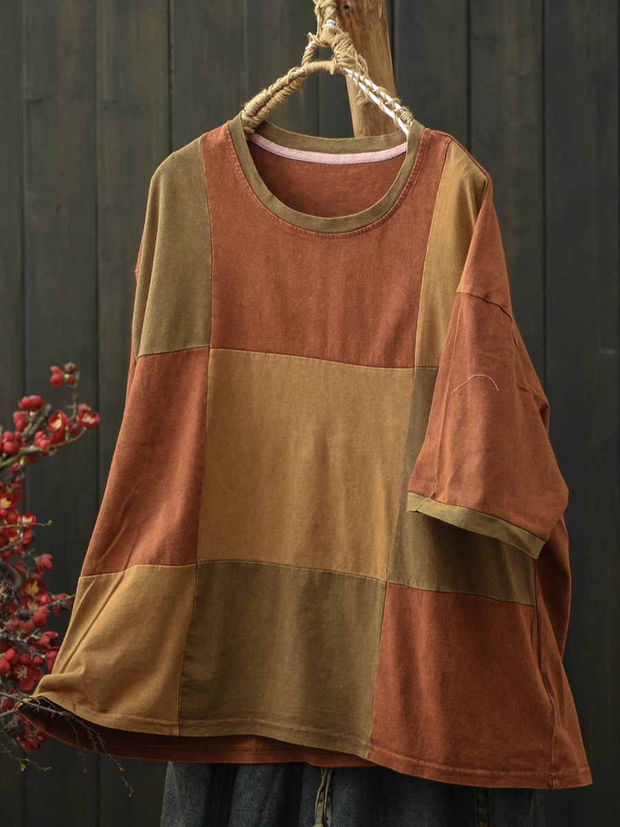 Damen Sommer Retro Patchwork Rundhals T-Shirt