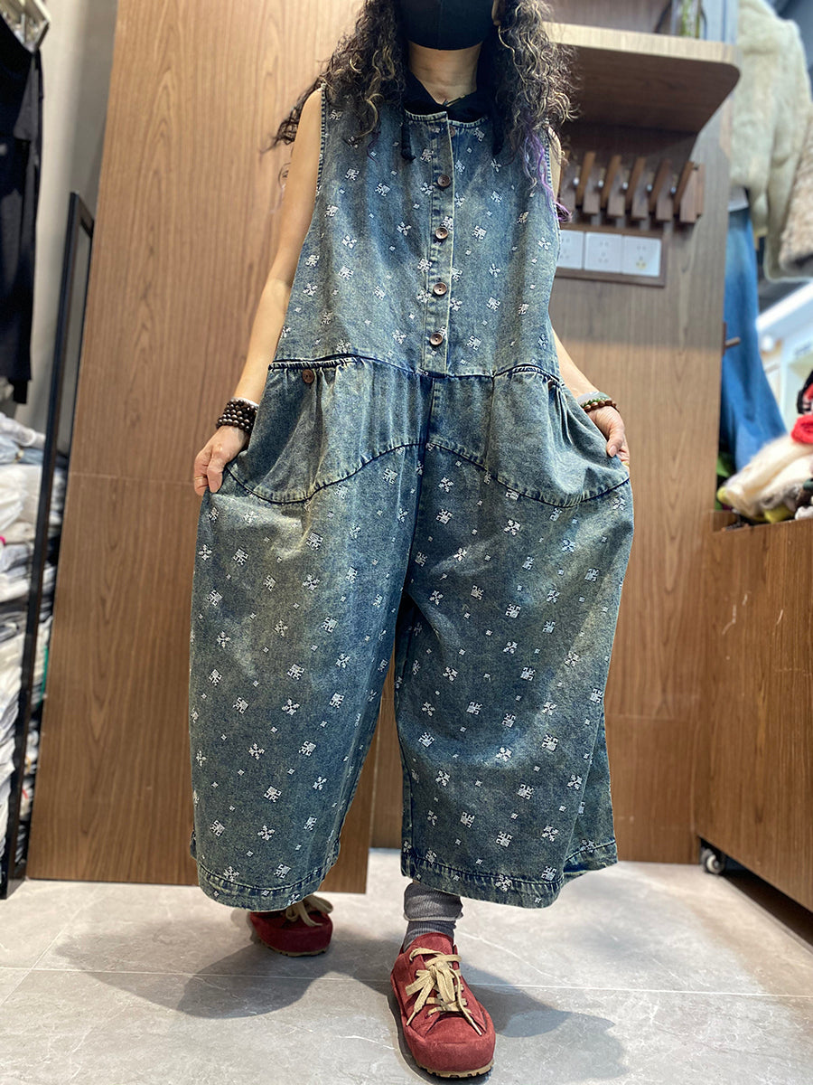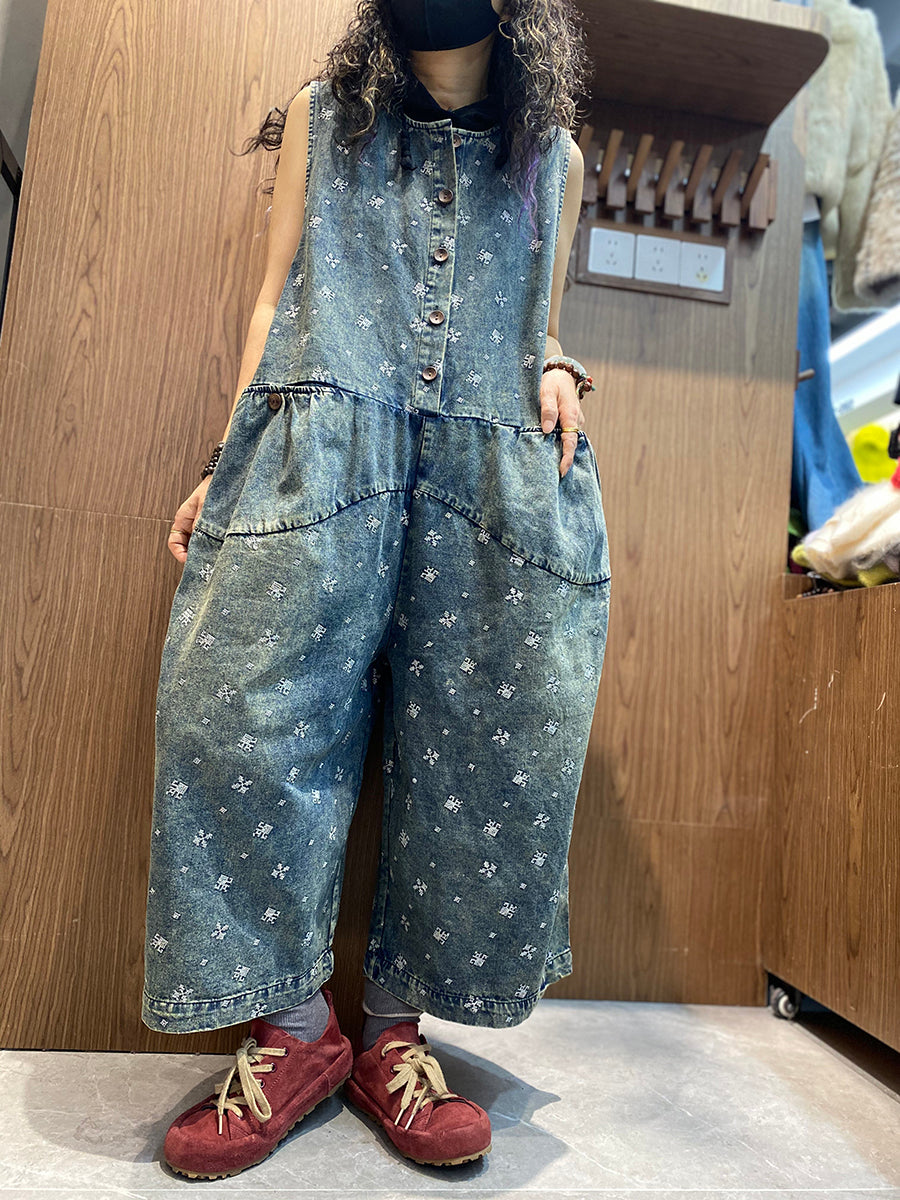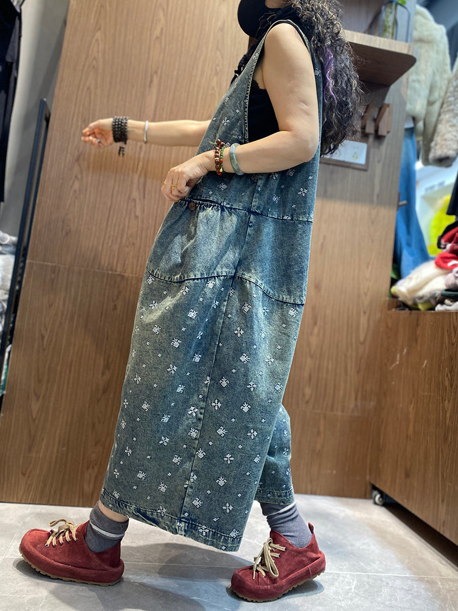 Damen Sommer Vintage Stickerei Denim Jumpsuits