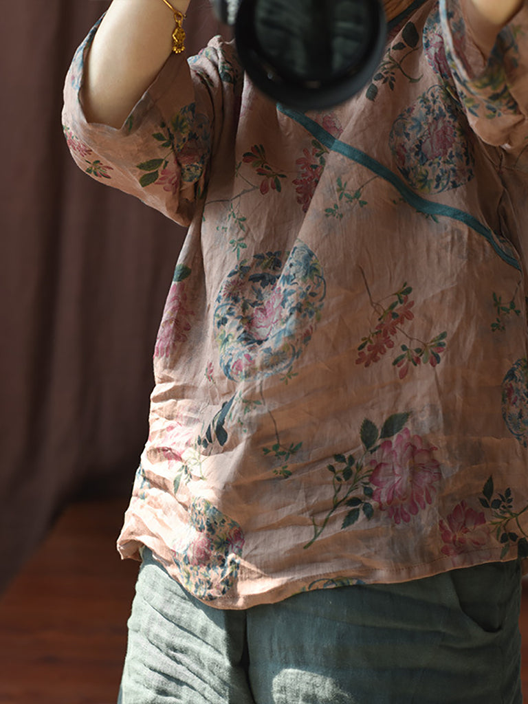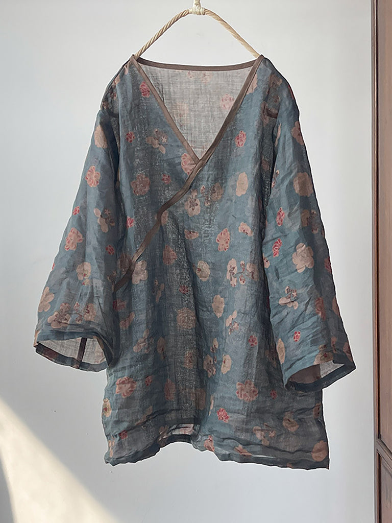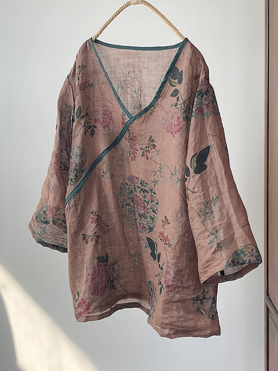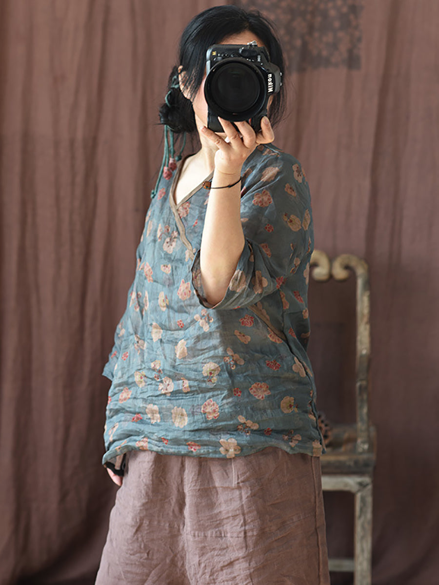 Damen Sommer Vintage Floral V-Ausschnitt Ramie Shirt