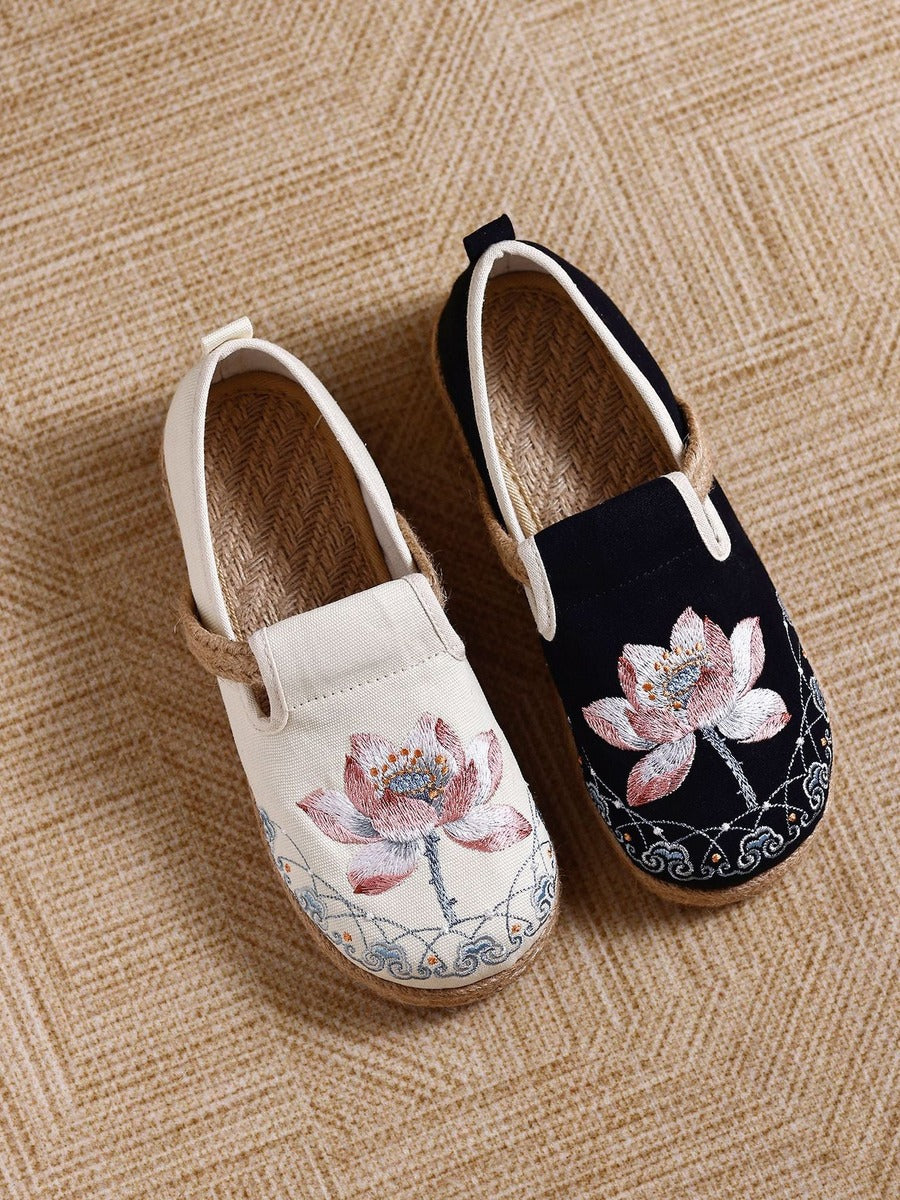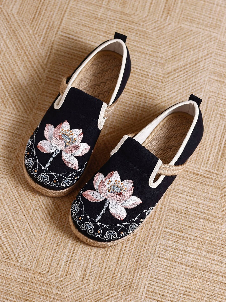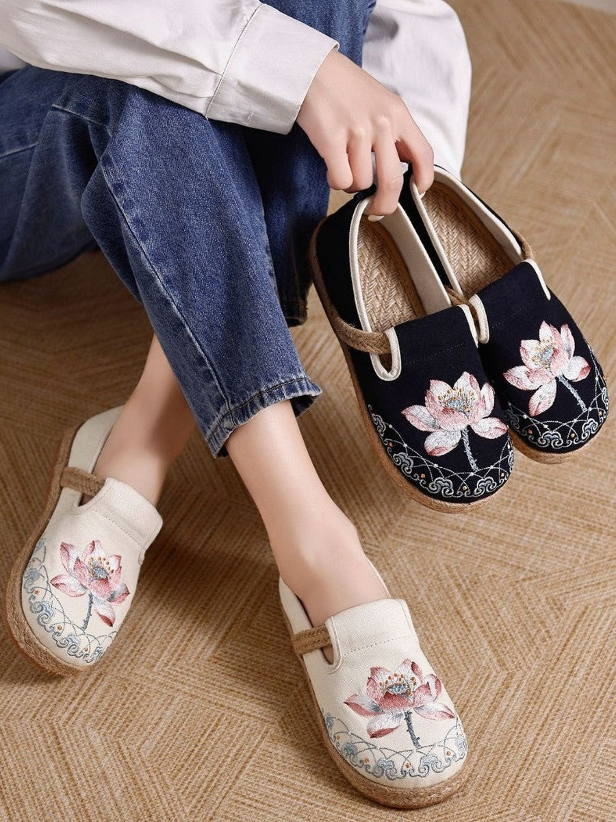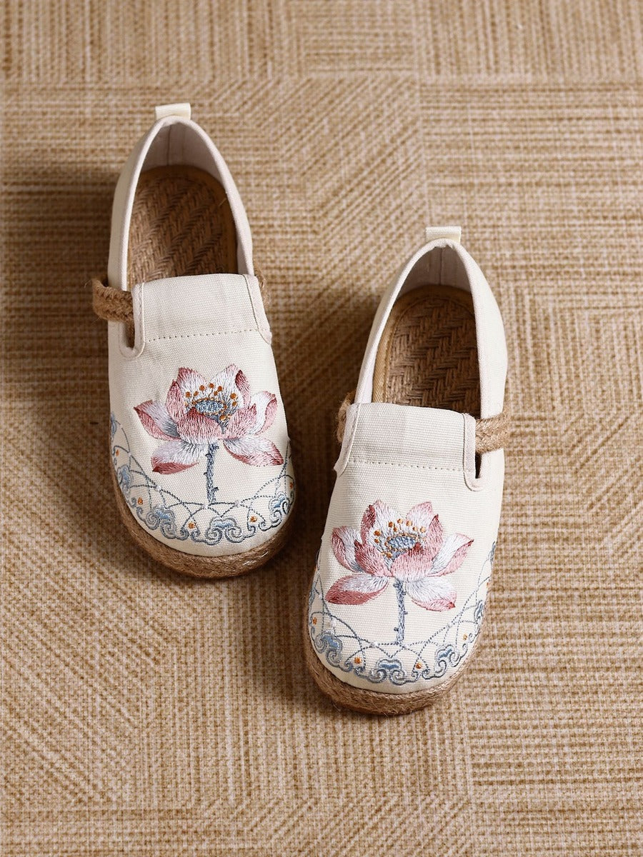 Handgefertigte Vintage-Schuhe aus Baumwollleinen mit kunstvollen Details. Bequem und atmungsaktiv für den Alltag.