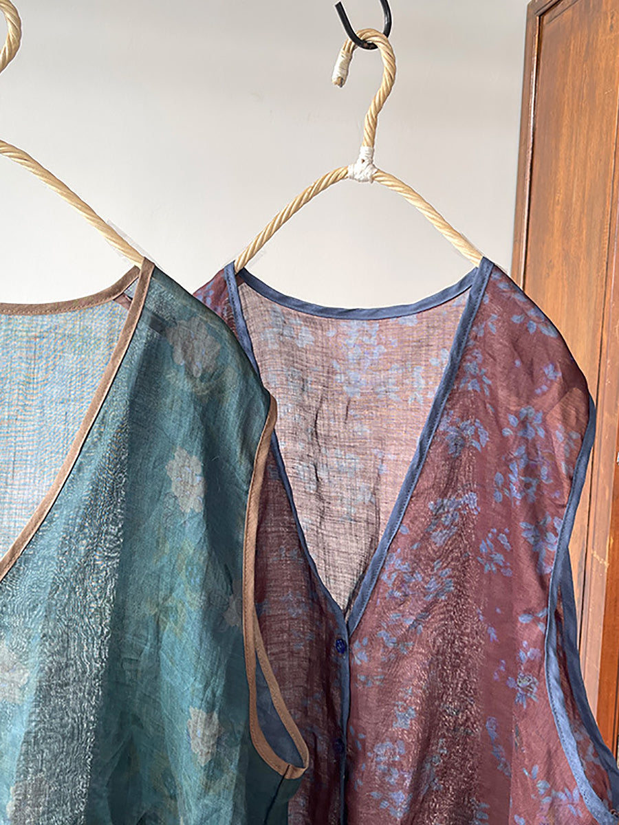 Diese Weste besteht aus 100 % Ramie und verfügt über ein Blumenmuster, einen V-Ausschnitt und einen Vintage-Stil. Sie ist perfekt für die Frühlings- und Sommersaison.
