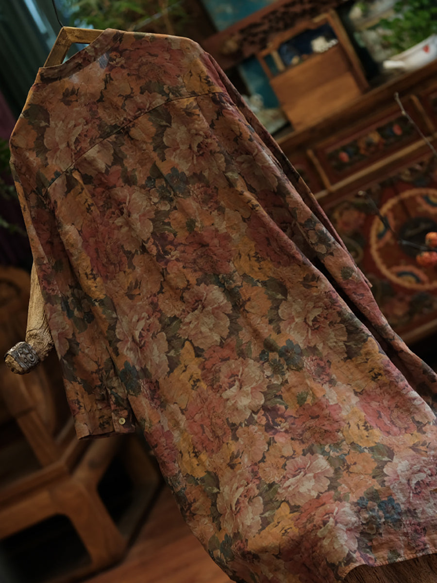 Damen Vintage Floral Retro Ramie Button-up Long Shirt