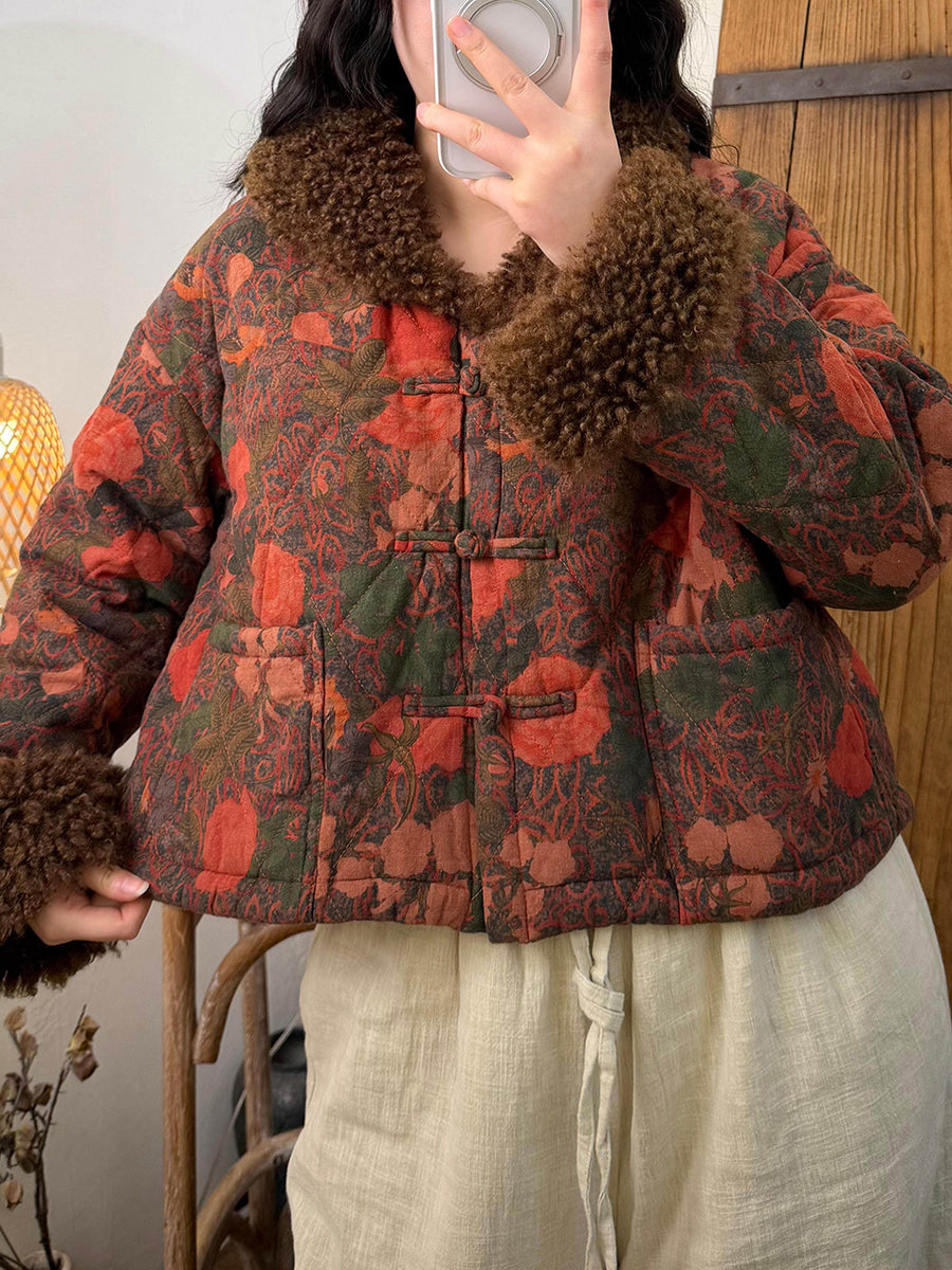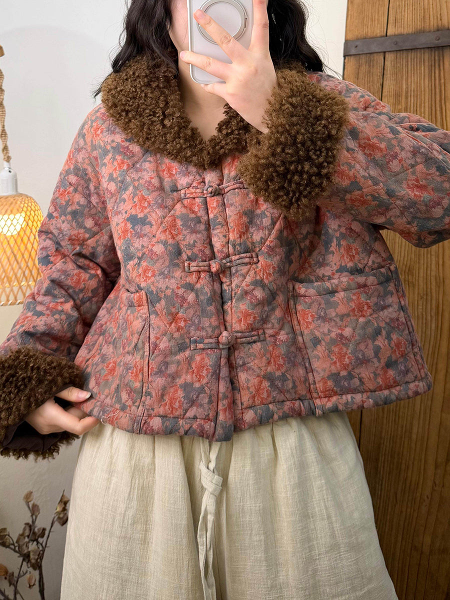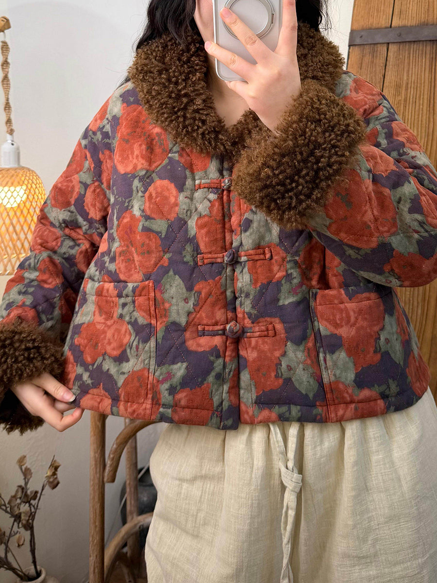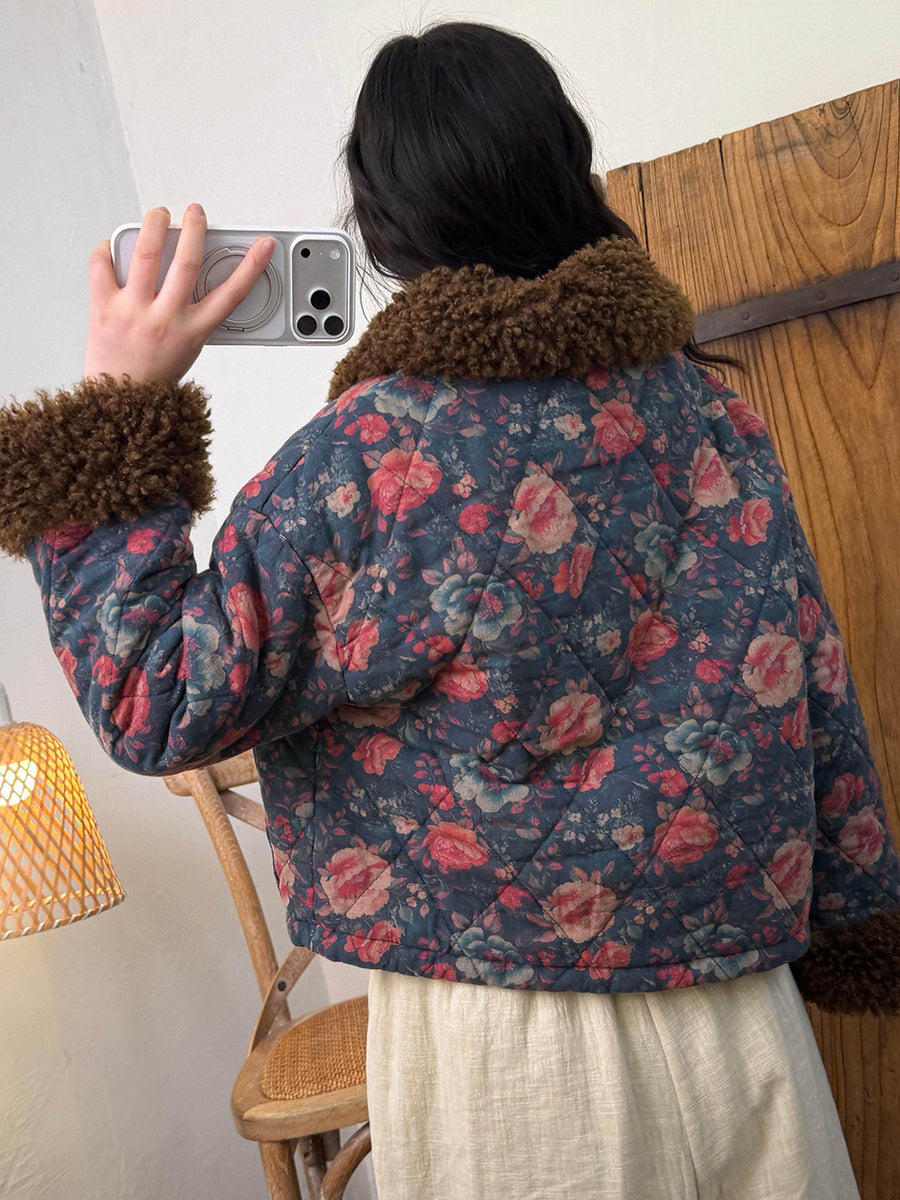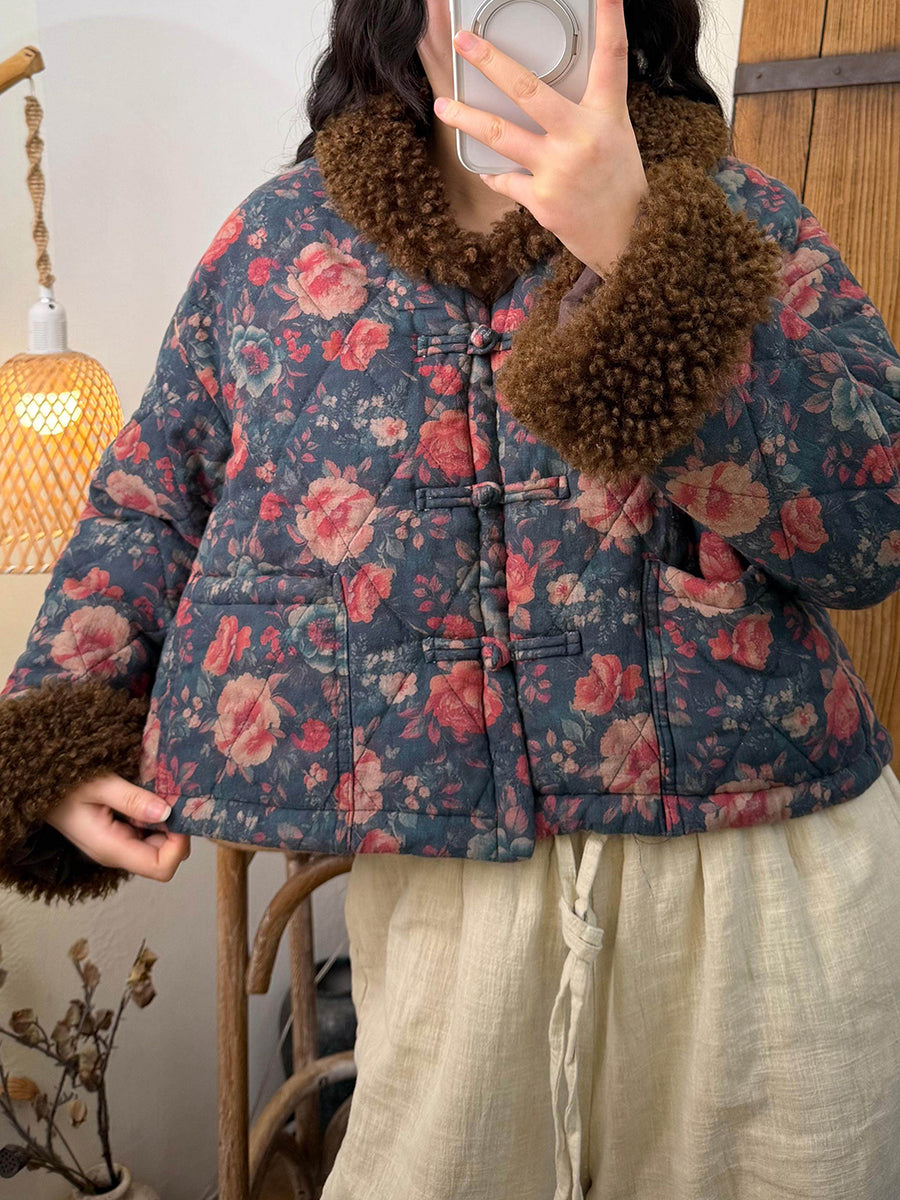 Damen Wintermantel aus Fleece mit Blumenmuster, wattiert und mit Rundhalsausschnitt