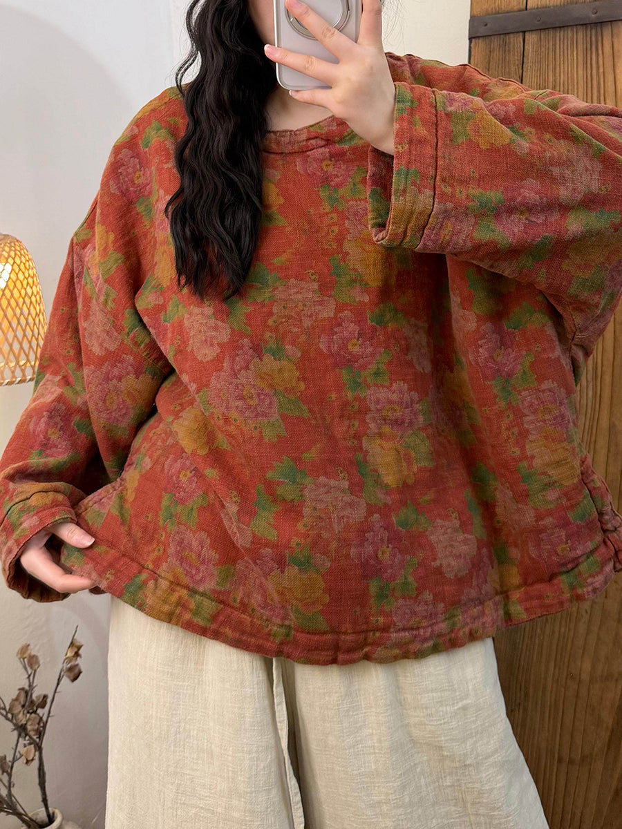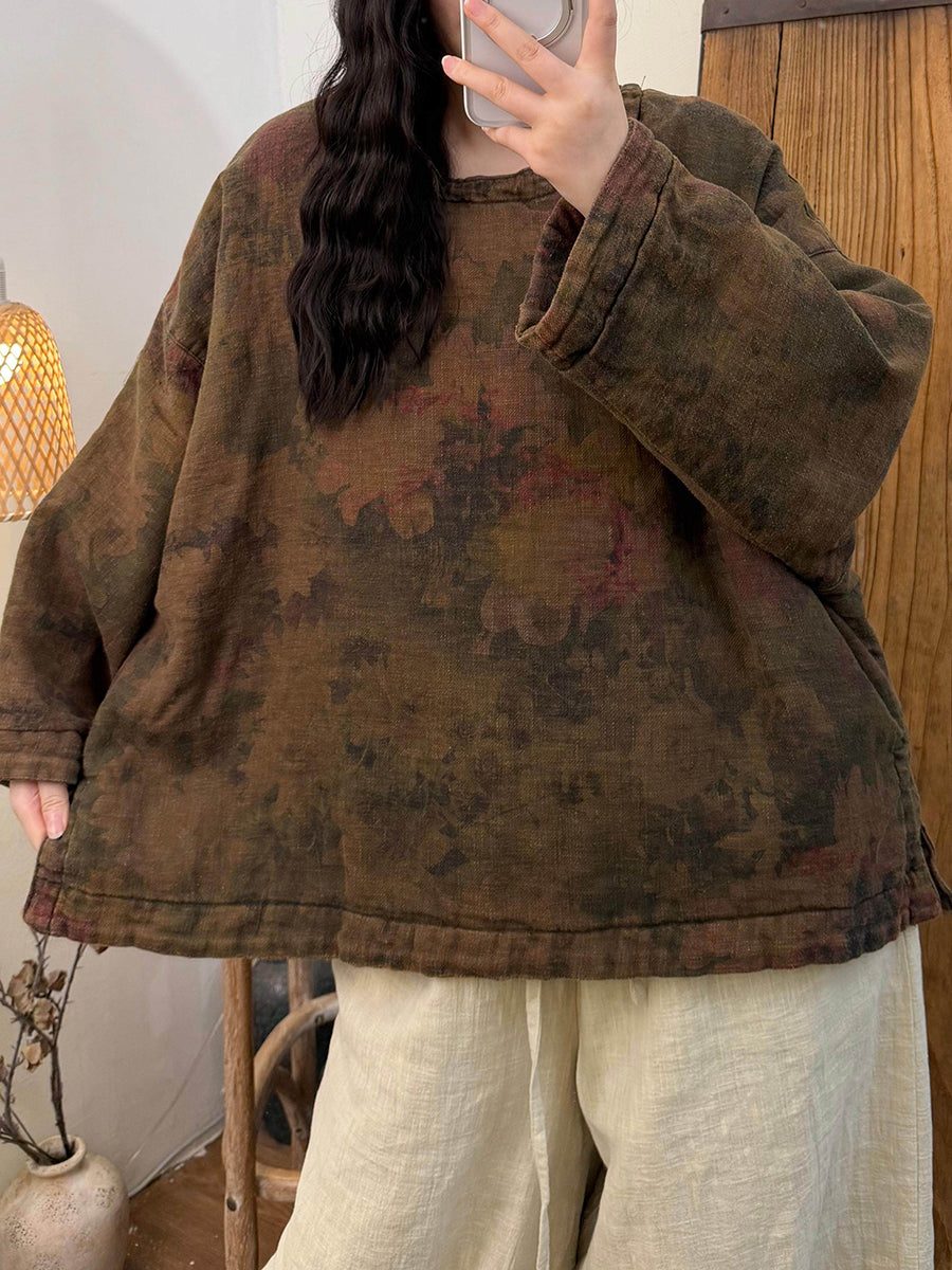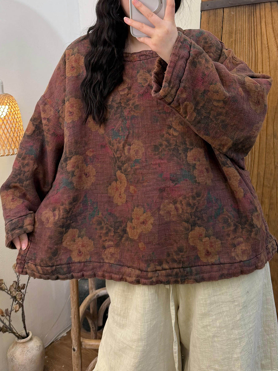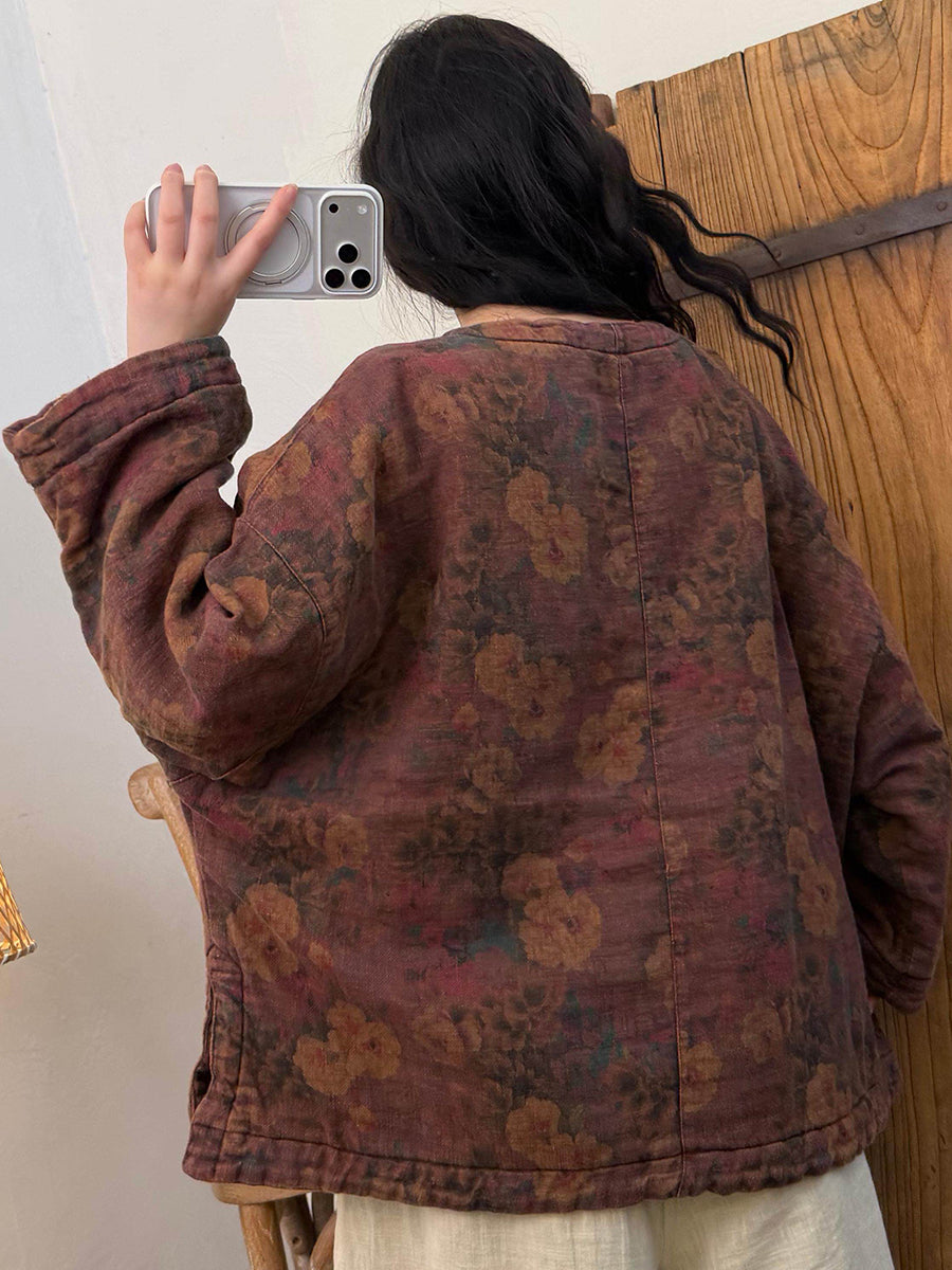 Damen Wintermantel im Retro-Stil mit abgenutztem Blumenmuster und Rundhalsausschnitt